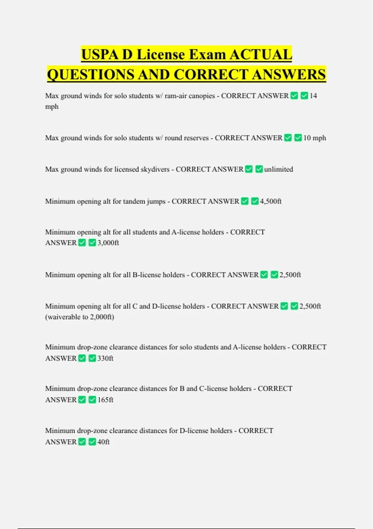 USPA D License Exam ACTUAL QUESTIONS AND CORRECT ANSWERS Max ground winds for solo students w/ ram-air canopies - CORRECT ANSWER mph Max ground winds for solo students w/ round reserves - CORRECT ANSWER Max ground winds for licensed skydivers - CORRECT ANSWER Minimum opening alt for tandem jumps - CORRECT ANSWER unlimited 4,500ft Minimum opening alt for all students and A-license holders - CORRECT ANSWER 3,000ft Minimum opening alt for all B-license holders - CORRECT ANSWER Minimum opening alt for all C and D-license holders - CORRECT ANSWER (waiverable to 2,000ft) 330ft 2,500ft 14 10 mph 2,500ft Minimum drop-zone clearance distances for solo students and A-license holders - CORRECT ANSWER Minimum drop-zone clearance distances for B and C-license holders - CORRECT ANSWER 165ft Minimum drop-zone clearance distances for D-license holders - CORRECT ANSWER 40ft