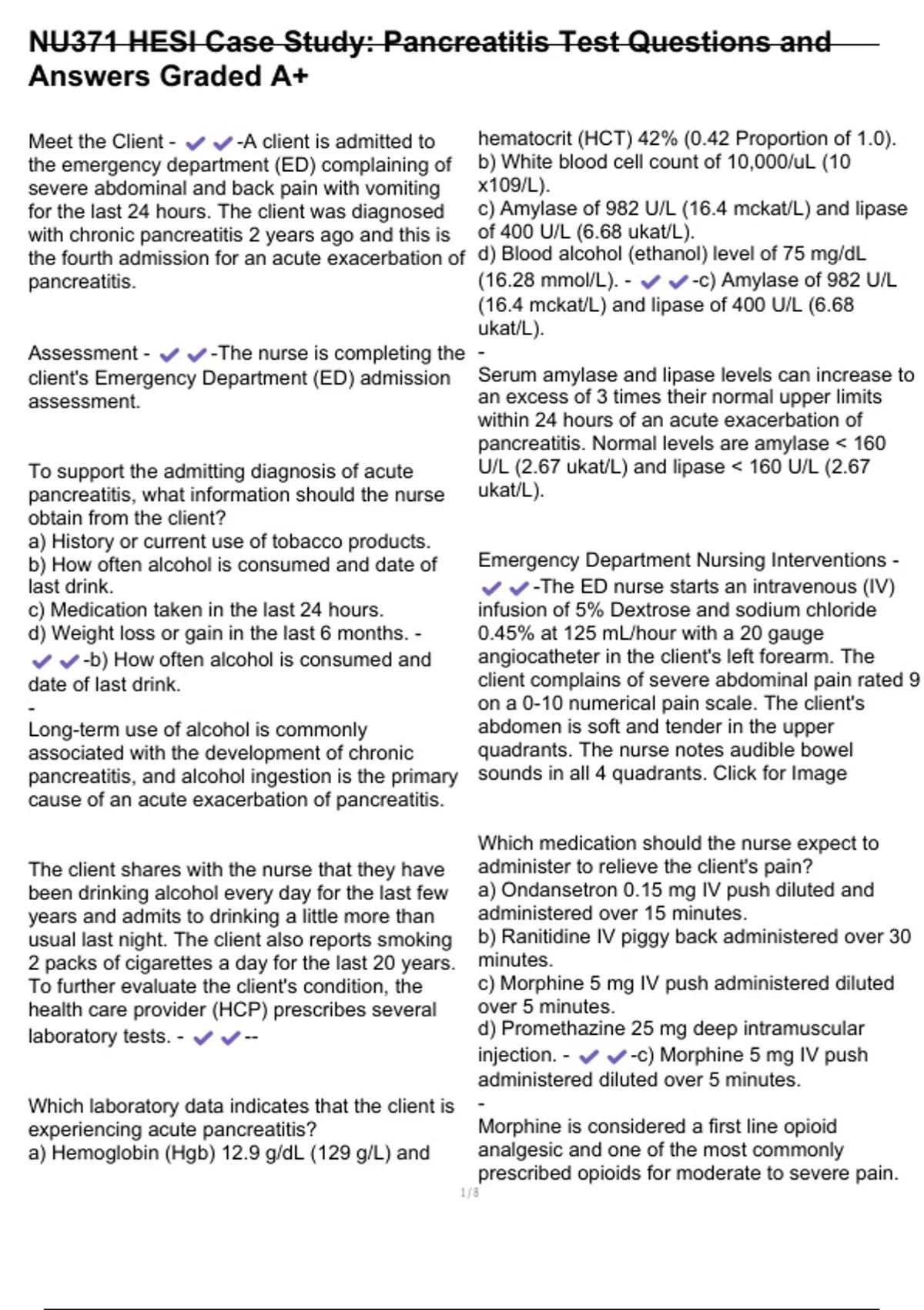 NU371 HESI Case Study: Pancreatitis Test Questions and