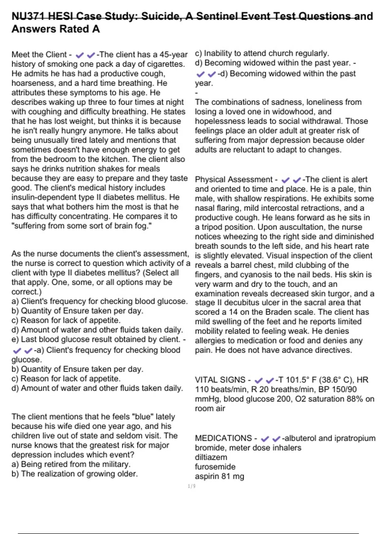 NU371 HESI Case Study: Suicide, A Sentinel Event Test Questions and Answers Rated A