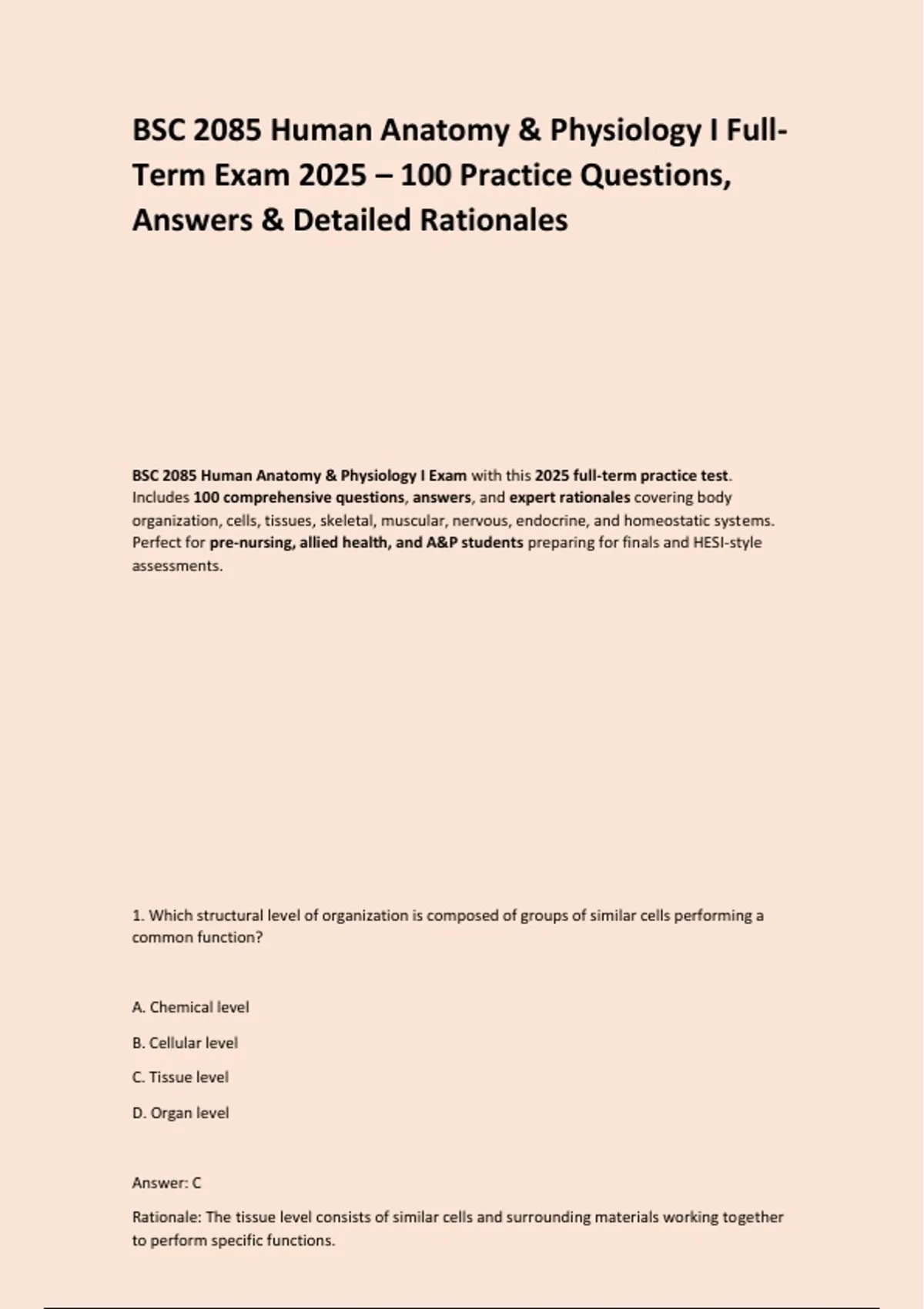 BSC 2085 Human Anatomy & Physiology I Full-Term Exam 2025 – 100 Practice Questions, Answers & Detailed Rationales BSC 2085 Human Anatomy & Physiology I Exam with this 2025 full-term practice test. Includes 100 comprehensive questions, answers, and expert