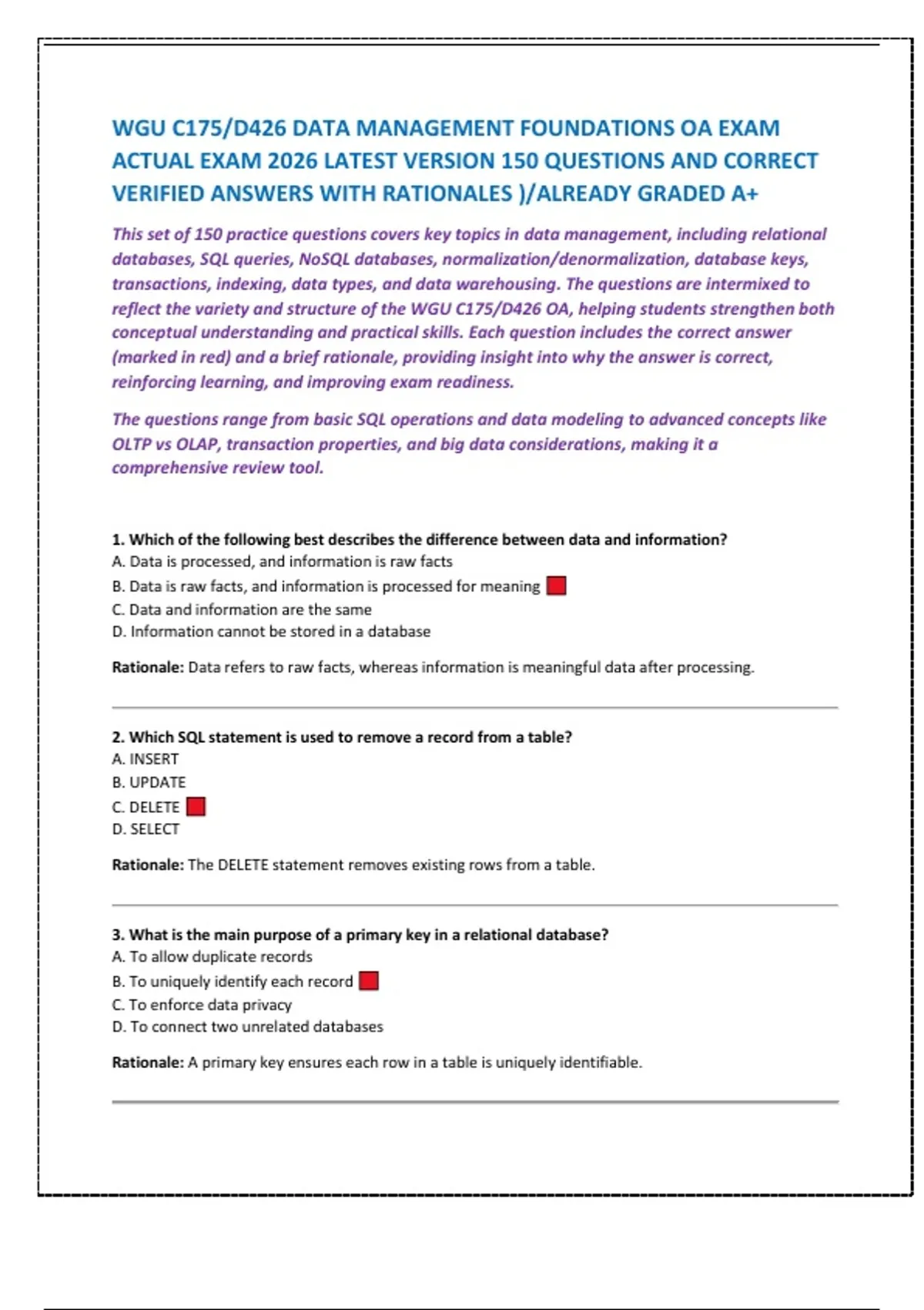 This set of 150 practice questions covers key topics in data management, including relational