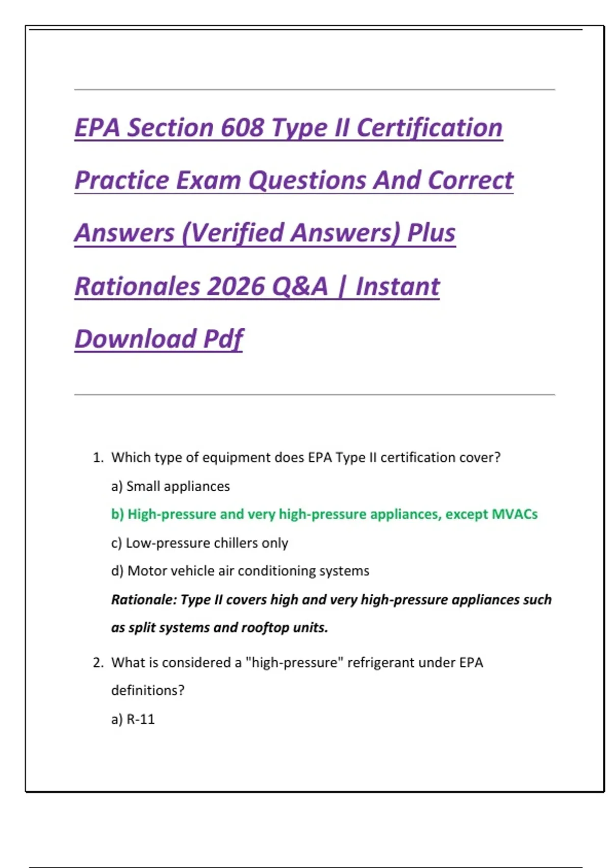 EPA Section 608 Type II Certification Practice Exam Questions And Correct Answers (Verified Answers) Plus Rationales 2026 Q&A | Instant Download Pdf