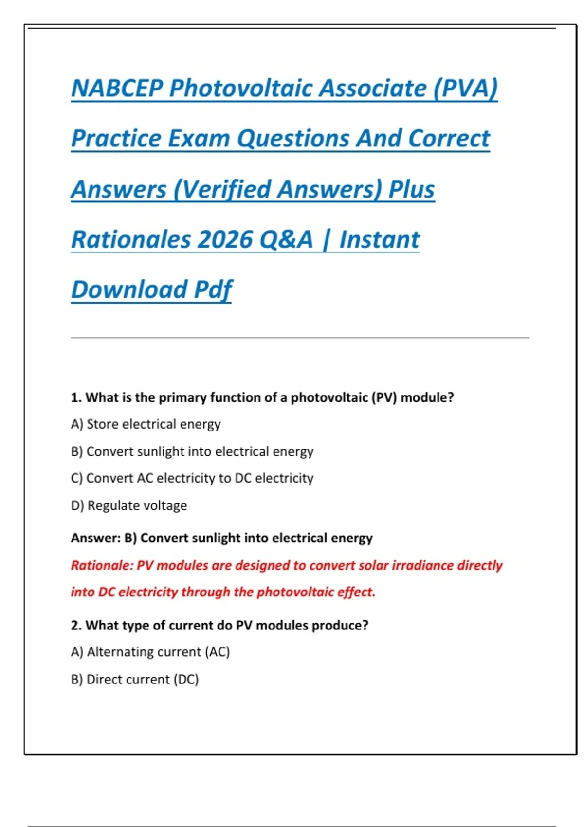 NABCEP Photovoltaic Associate (PVA) Practice Exam Questions And Correct Answers (Verified Answers) Plus Rationales 2026 Q&A | Instant Download Pdf