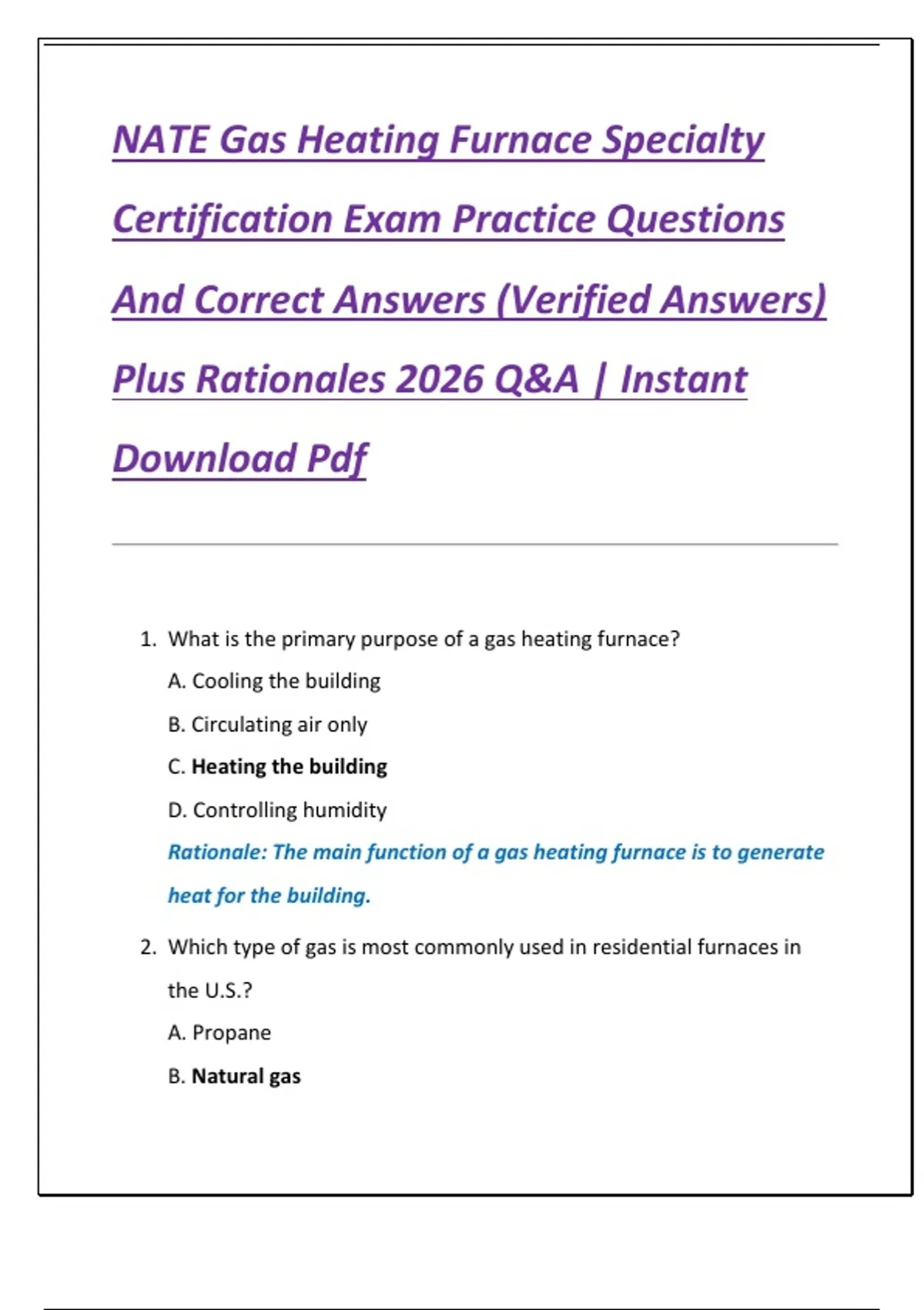 NATE Gas Heating Furnace Specialty Certification Exam Practice Questions And Correct Answers (Verified Answers) Plus Rationales 2026 Q&A | Instant Download Pdf