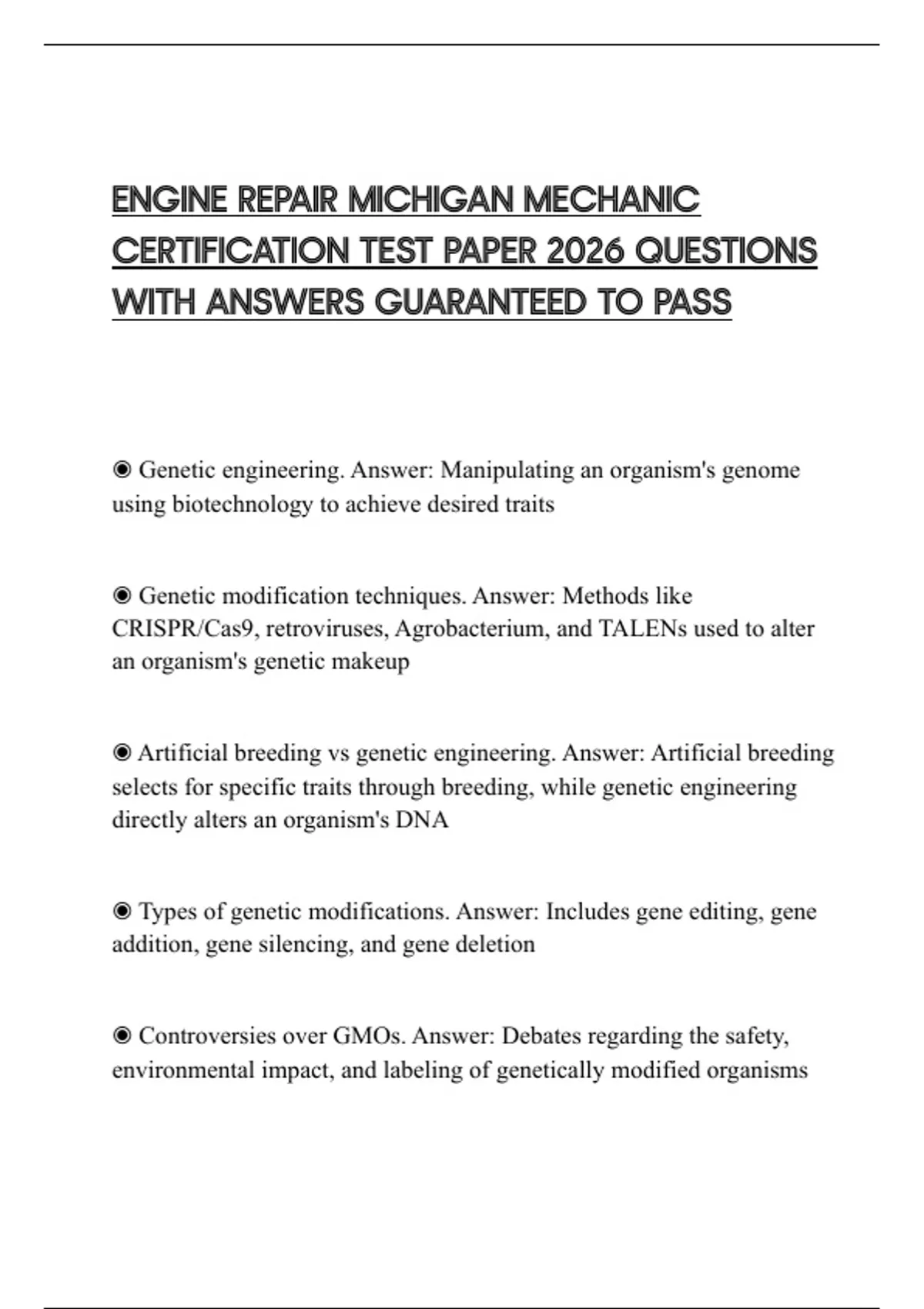 ENGINE REPAIR MICHIGAN MECHANIC CERTIFICATION TEST PAPER 2026 QUESTIONS WITH ANSWERS GUARANTEED TO PASS