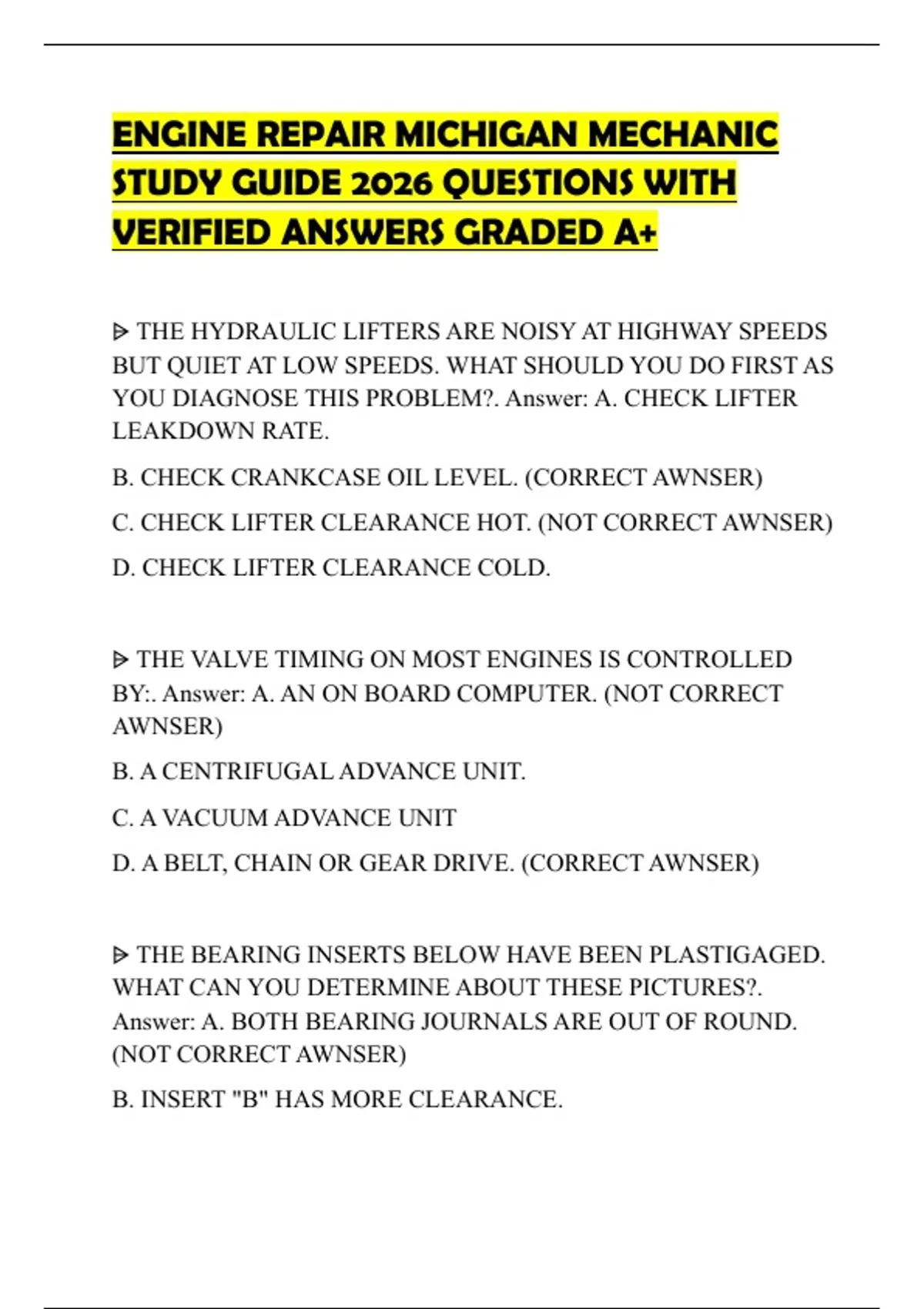ENGINE REPAIR MICHIGAN MECHANIC STUDY GUIDE 2026 QUESTIONS WITH VERIFIED ANSWERS GRADED A+