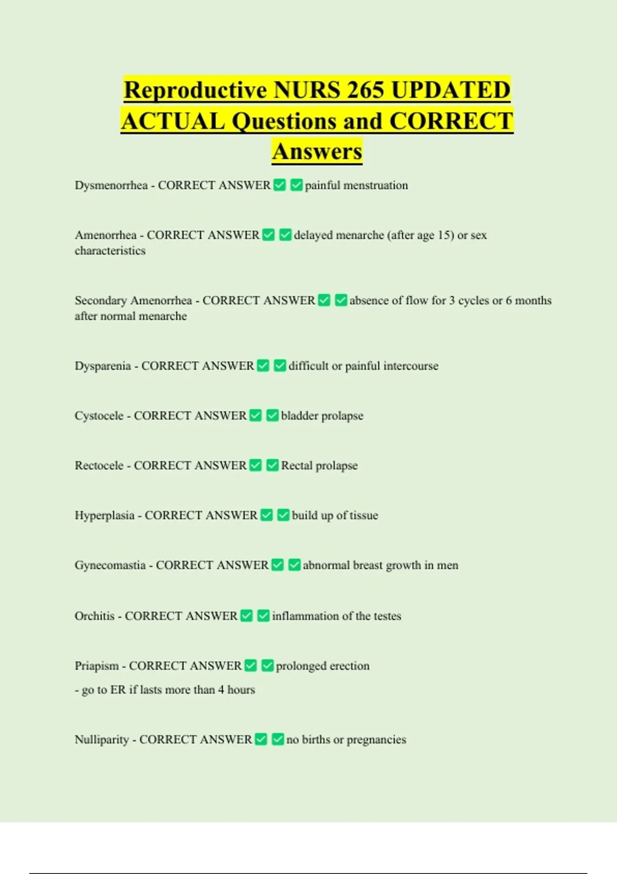 Reproductive NURS 265 UPDATED ACTUAL Questions and CORRECT Answers