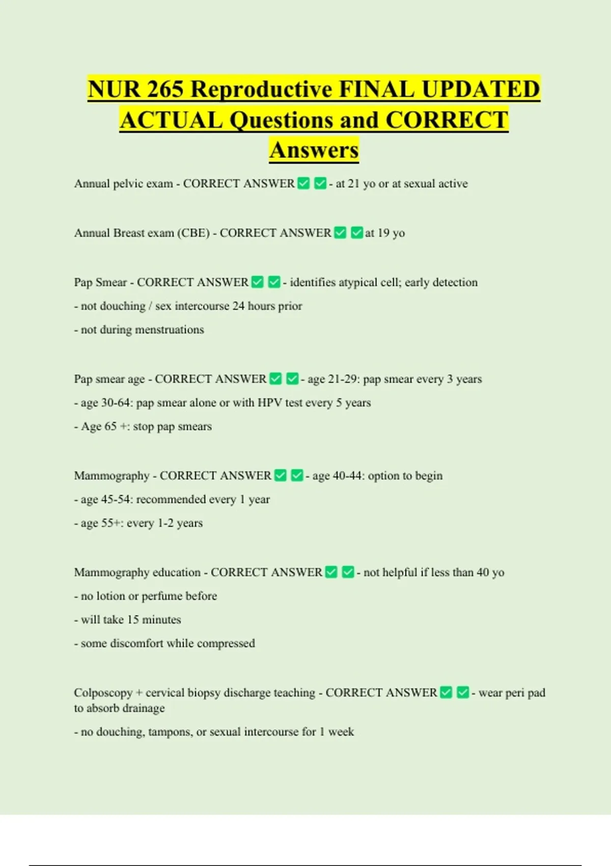 NUR 265 Reproductive FINAL UPDATED ACTUAL Questions and CORRECT Answers