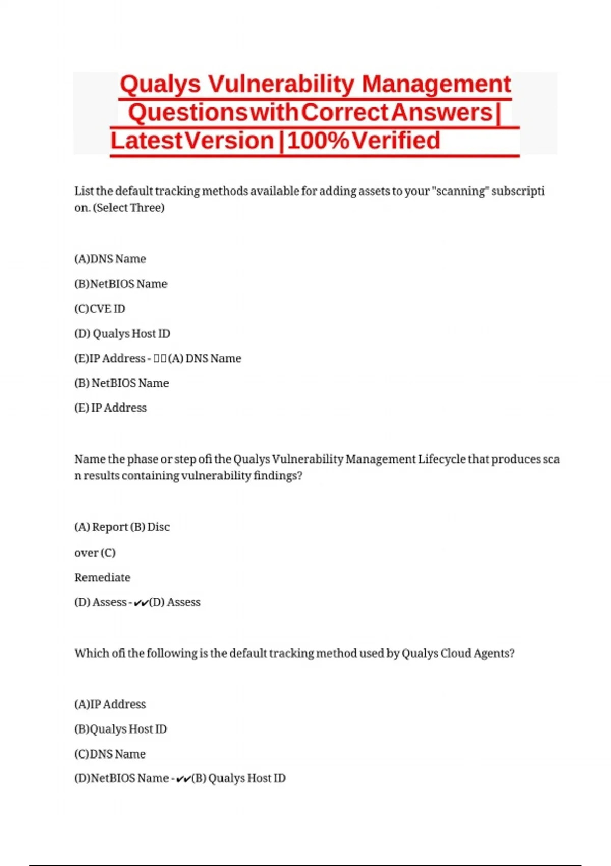 This document provides a full set of Qualys Vulnerability Management questions with verified correct answers for exam and certification preparation. It covers key topics such as asset discovery, vulnerability scanning, remediation workflows, reporting, and policy compliance. Ideal for cybersecurity professionals and students, this guide helps users understand the Qualys VM platform, best practices for vulnerability management, and real-world application of scanning tools.