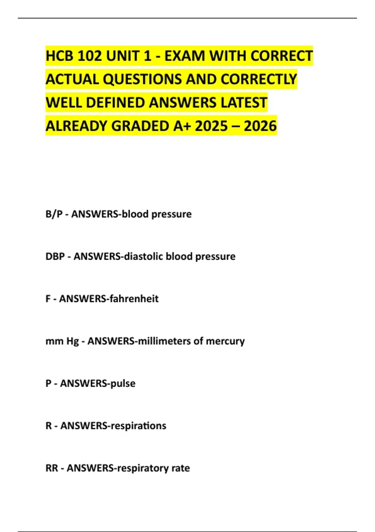 HCB 102 UNIT 1 - EXAM WITH CORRECT ACTUAL QUESTIONS AND CORRECTLY WELL DEFINED ANSWERS LATEST ALREADY GRADED A+ 2025 – 2026