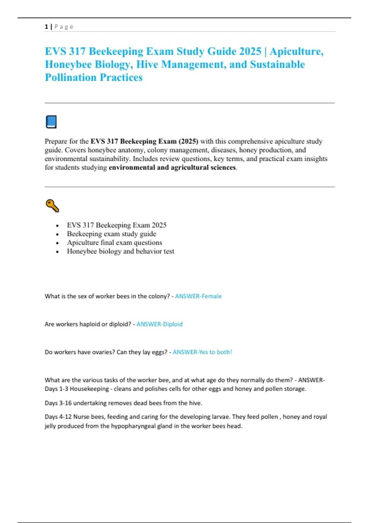 EVS 317 Beekeeping Exam Study Guide 2025 | Apiculture,
