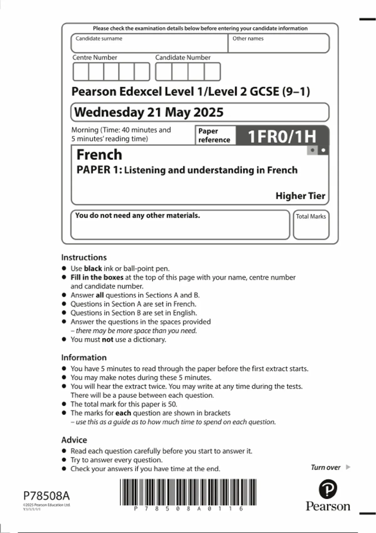 2025 PEARSON EDEXCEL GCSE FRENCH PAPER 1H HIGHER TIER QUESTION PAPER (1FR0/1H: Listening and understanding in French)