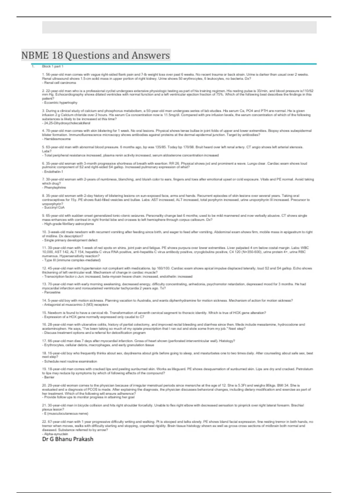 This document contains the complete set of NBME 18 questions and verified answers, updated for 2025/2026. It serves as a comprehensive review tool for USMLE Step 1 preparation, covering all key systems and disciplines including physiology, pathology, pharmacology, microbiology, biochemistry, and behavioral science. Each question includes the correct answer and clear explanation to strengthen understanding of high-yield Step 1 concepts and test-taking strategies. Ideal for medical students seeking an authentic NBME-style practice experience.