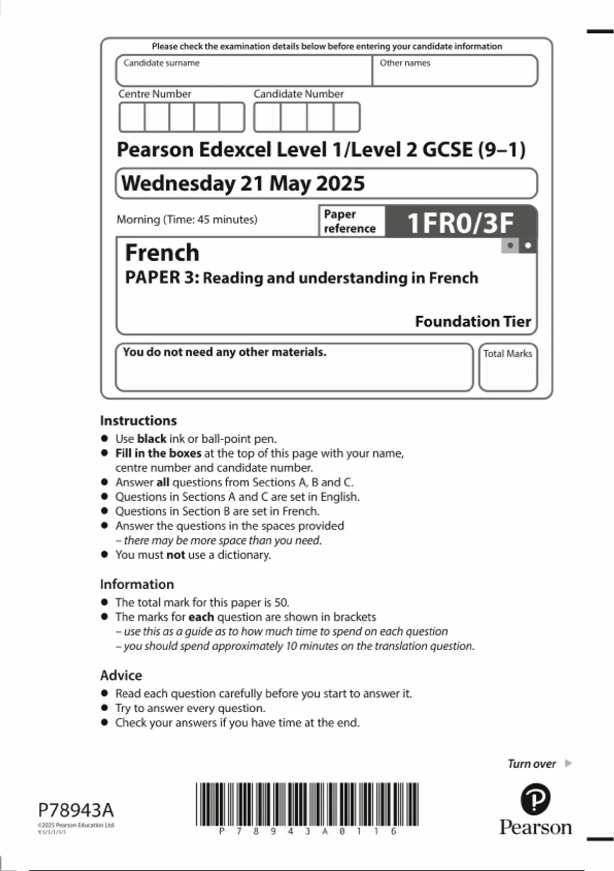 2025 PEARSON EDEXCEL GCSE FRENCH PAPER 3F FOUNDATION TIER QUESTION PAPER (1FR0/3F: Reading and understanding in French)