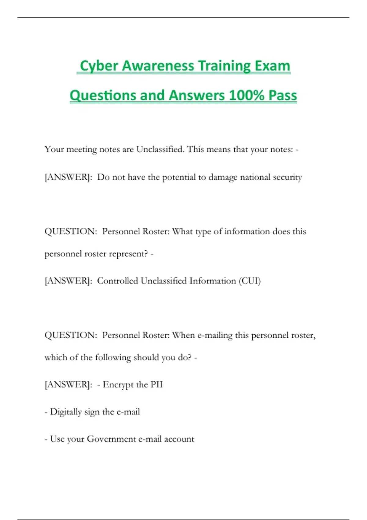 Cyber Awareness Training Exam Questions and Answers 100% Pass