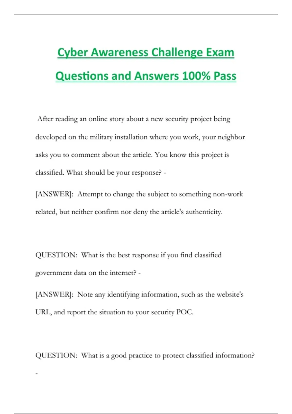 Cyber Awareness Challenge Exam Questions and Answers 100% Pass
