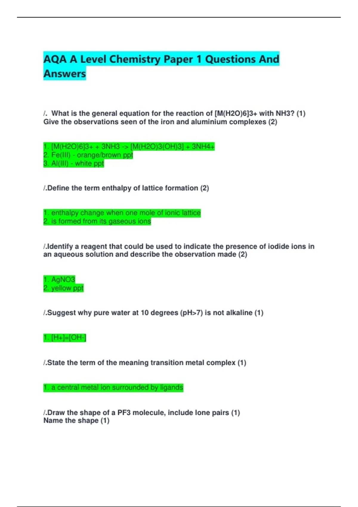 AQA A Level Chemistry Paper 1 Questions And Answers /. What is the general equation for the reaction of [M(H2O)6]3+ with NH3? (1) Give the observations seen of the iron and aluminium complexes (2) 1. [M(H2O)6]3+ + 3NH3 -> [M(H2O)3(OH)3] + 3NH4+ 2. Fe(III) - orange/brown ppt 3. Al(III) - white ppt /.Define the term enthalpy of lattice formation (2) 1. enthalpy change when one mole of ionic lattice 2. is formed from its gaseous ions /.Identify a reagent that could be used to indicate the presence of iodide ions in an aqueous solution and describe the observation made (2) 1. AgNO3 2. yellow ppt /.Suggest why pure water at 10 degrees (pH>7) is not alkaline (1) 1. [H+]=[OH-] /.State the term of the meaning transition metal complex (1) 1. a central metal ion surrounded by ligands /.Draw the shape of a PF3 molecule, include lone pairs (1) Name the shape (1) trigonal pyramidal Suggest why the oxidation state of chromium is zero in Cr(PF3)6 (1) 1. PF3 has no overall charge and the complex has no overall charge /.Deduce the oxidation state of chromium in the [Cr(NH3)4Cl2] (1) 1. +2 /.Name the type of bond between N and H in ammonia (1) 1. covalent bond Draw the two isomers of [Cr(NH3)4Cl2]+ (2) /.State the isomerism shown (1) cis/trans isomerism /.Complete the equation to show the formation of one complex that contains chromium in its +3 oxidation state (1) CrCl3 + 5H2O -> 1. [Cr(H2O)5Cl]Cl2 /.Give the electron configuration of the Al3+ ion (1) 1. 1s2, 2s2, 2p6 /.Give the equation for the reaction between Al2(SO4)3 and water forming a solution containing the complex ion [Al(H2O)6]3+ (1) 1. Al2(SO4)3 + 12H2O -> 2[Al(H2O)6]3+ + 3SO42- /.Explain why the solution containing [Al(H2O)6]3+ is acidic (2) 1. Al3+ has a high charge and small size/high charge density 2.AL3+ weakens the O-H bond in water ligand and donates H+ to water /.State why the concentration of aluminium sulfate solution can't be determined by colorimetry (1) 1. its a colourless solution /.Give the ionic equation for the reaction of [Al(H2O)6]3+ with excess aqueous ammonia (1) State one observation (1) 1. [Al(H2O)6]3+ + 3NH3 -> [Al(H2O)3(OH)3] + 3NH4+ 2. white ppt /.State the meaning of the term electrochemical series (1) 1. electrode potentials in numerical order /.State the equations which go on at the positive electrode (cathode) and negative electrode (anode) for a lithium ion cell (2) Deduce the overall equation of the reaction (1) State the cell EMF (1) 1. cathode: Li+ + CoO2 + e- -> LiCoO2 2. anode: Li+ + e- -> Li 3. overall equation: CoO2 + Li → LiCoO2 (for charging, the equation is the other way around) 4. cell EMF: +0.6 - -3.00 = 3.6 V /.State the equations which go on at the positive electrode (cathode) and negative electrode (anode) for a hydrogen-oxygen fuel cell (2) Deduce the overall equation of the reaction (1) State the cell EMF (1) 1. cathode: O2 + 2 H2O + 4 e- -> 4 OH- 2. anode: H2 + 2OH- -> 2H2O + 2e- 3. overall equation: 2H2 + O2. -> 2H2O 4. cell EMF: +0.4 - -0.83 = 1.23 V /.State the property of SO2 that causes pollution when it enters rivers (1) Give an equation for the reaction of SO2 with water (1) 1. acidic