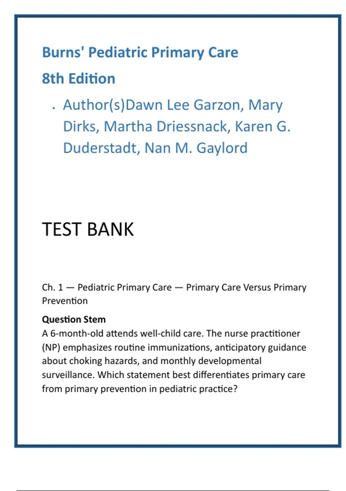 Burns' Pediatric Primary Care 8th Ed — Complete Test Bank (20 MCQs/Chapter) for PNP, FNP & NCLEX Prep Description: Maximize exam performance and clinical confidence with the definitive Burns' Pediatric Primary Care — 8th Edition Test Bank. Built to mirror the gold-standard textbook, this comprehensive digital resource provides FULL textbook coverage — ALL chapters — with 20 clinically focused MCQs per chapter plus correct answers and expert-verified rationales for every item. Designed for Pediatric Nurse Practitioners (PNP), Family Nurse Practitioners (FNP), DNP students, NCLEX candidates, and advanced practice nurses, this test bank accelerates mastery of pediatric assessment, growth and development, acute and chronic conditions, and evidence-based management. Why learners choose this product: time-saving organization, evidence-based question design, and performance-boosting analytics-ready content that translates directly into higher NP exam scores and stronger clinical decision-making. Use for targeted study, group review, mock exams, or curriculum integration. Key features: Complete coverage of Burns' Pediatric Primary Care, 8th Edition (ALL chapters) 20 MCQs per chapter (uniform depth & scope) Correct answers + expert-verified rationales for every item Clinically realistic stems emphasizing application and critical thinking Ideal for PNP, FNP, DNP, NCLEX, and advanced practice nursing exam prep Instant digital download, editable for classroom or self-study Trust Burns’ reputation as the pediatric primary care gold standard — this test bank turns trusted content into measurable exam readiness. Prepare smarter, gain clinical confidence, and walk into your exam ready to perform. Keywords: Burns Pediatric Primary Care test bank Burns Pediatric Primary Care 8th edition pediatric nursing MCQs PNP exam prep pediatric NP practice questions FNP exam prep pediatrics NCLEX pediatric practice questions advanced practice nursing test bank Hashtags: #PediatricNursing #BurnsPediatric #TestBank #PNPPrep #FNPExamPrep #NCLEXPrep #PediatricsMCQs #AdvancedPracticeNursing #NursingStudents #DigitalStudyResources