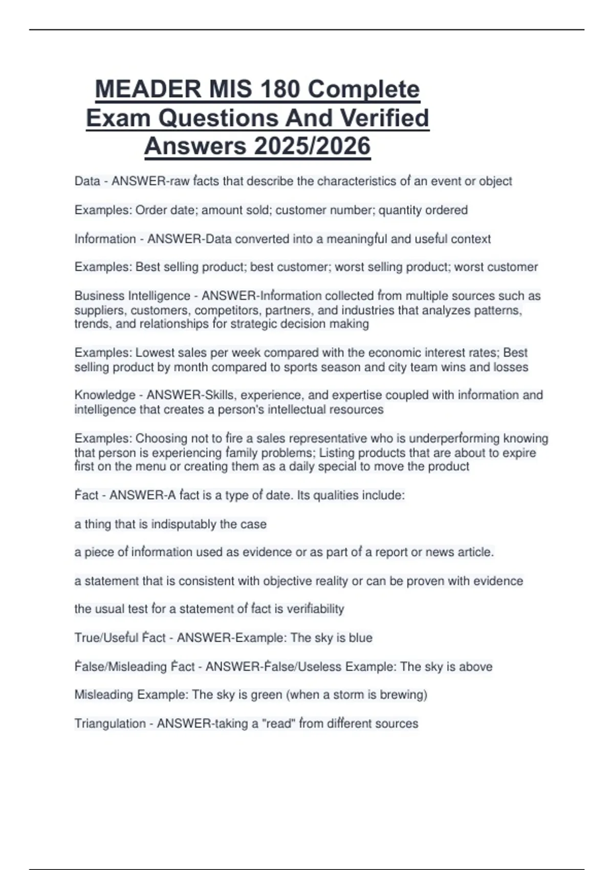 MEADER MIS 180 Complete Exam Questions And Verified Answers 2025/2026