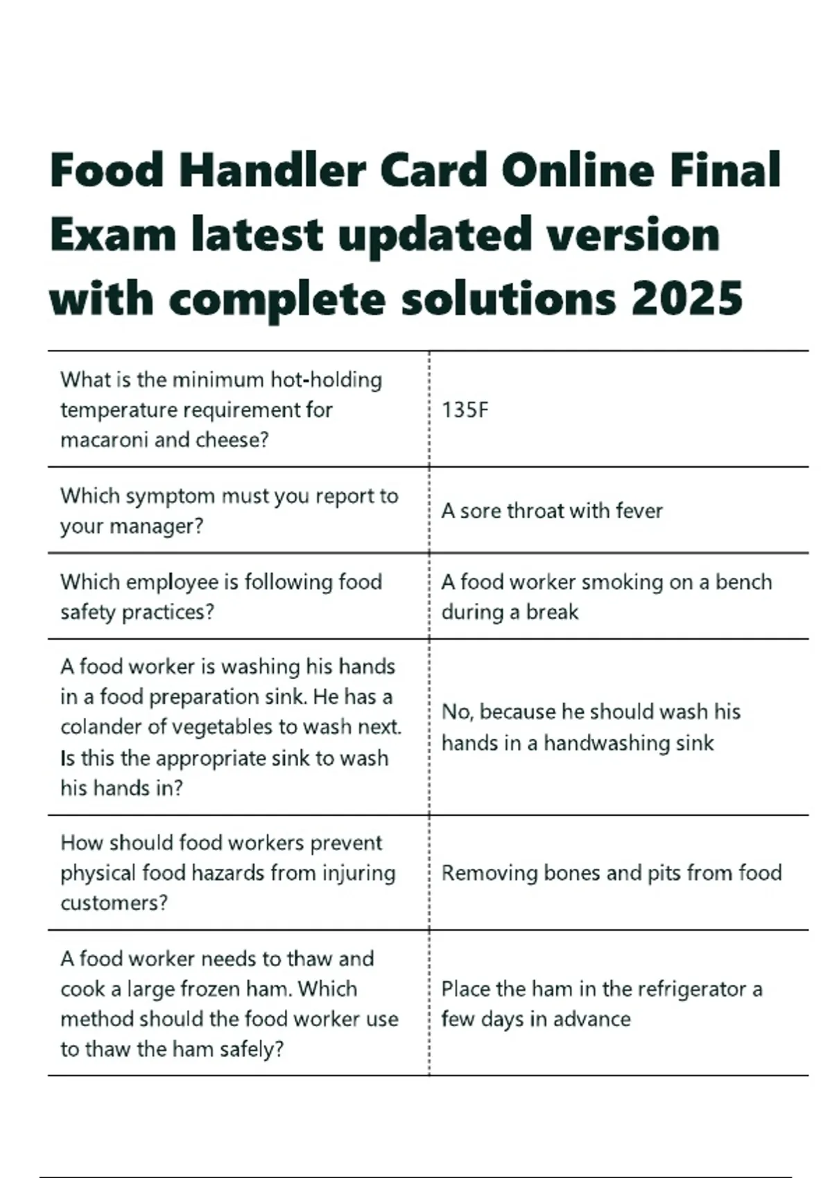 Food Handler Card Online Final Exam latest updated version with complete solutions 2025