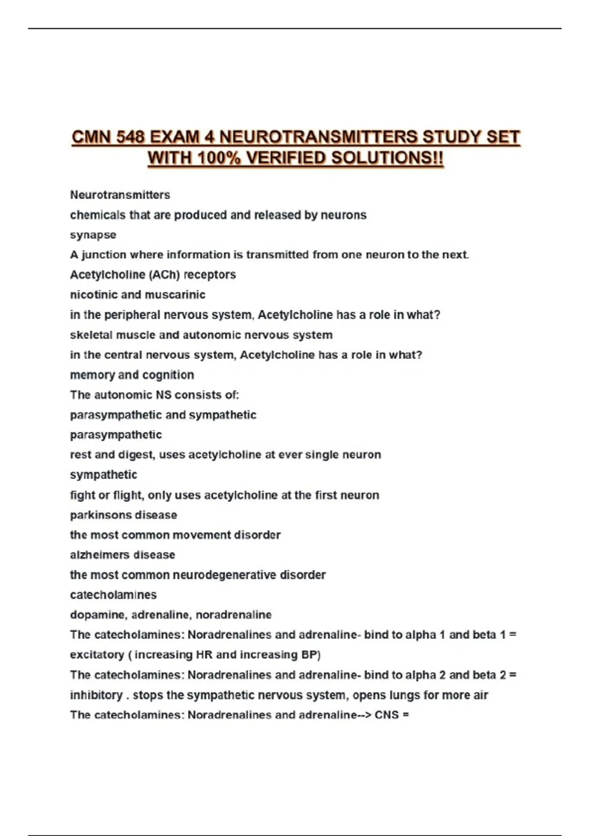 CMN 548 EXAM 4 NEUROTRANSMITTERS STUDY SET WITH 100% VERIFIED SOLUTIONS!!...