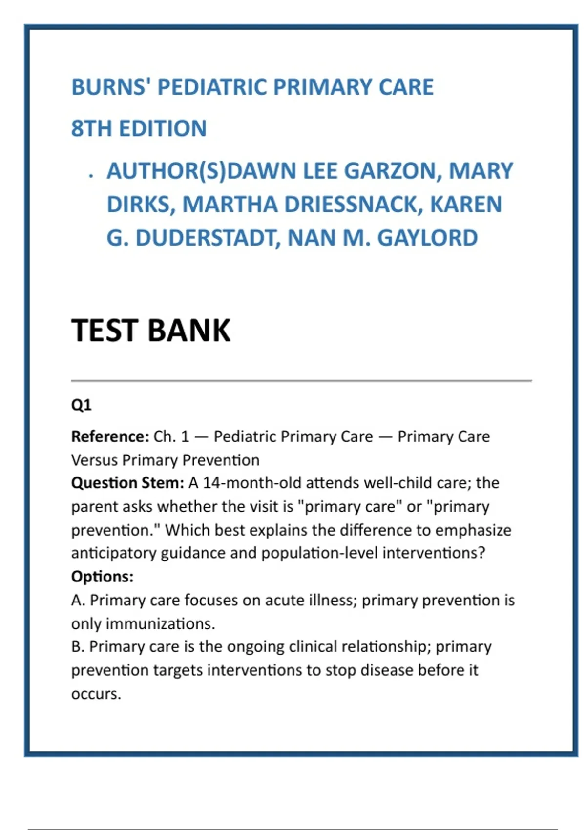 Burns Pediatric Primary Care Test Bank — 20 MCQs/Chapter | Full Coverage (8th Ed.) — PNP, FNP & NCLEX Prep Description: Master pediatric primary care with the most comprehensive, exam-focused digital test bank aligned to Burns’ Pediatric Primary Care — 8th Edition. This complete test bank delivers 20 clinically-focused MCQs per chapter, each with one correct answer and expert-verified rationales, designed to build clinical reasoning, pathophysiologic understanding, and rapid decision-making for high-stakes nursing and advanced-practice exams. Save study time with bite-sized, evidence-based practice that mirrors real-world pediatric scenarios and the cognitive demands of PNP, FNP, DNP, and NCLEX testing. Designed for busy learners and educators, this product boosts confidence and exam performance by reinforcing applied knowledge, anticipatory guidance, and safety-focused clinical judgment. Ideal for individual study, group review, or course integration—use it for targeted remediation, formative assessment, or simulated exam sessions. Features: Complete coverage of all chapters from Burns’ Pediatric Primary Care — 8th Edition 20 multiple-choice questions per chapter (clinical, application, analysis, evaluation) Correct answers + expert-verified rationales for every item Exam-style stems emphasizing pediatric assessment, diagnostics, and prioritization Downloadable, print-ready digital format for study or LMS import Suitable for PNP, FNP, DNP, NCLEX, and pediatric nursing course prep Time-saving, evidence-based practice to improve scores and clinical readiness Trust Burns’ reputation as the gold standard in pediatric primary care—now transformed into a focused, high-yield test bank to accelerate mastery and exam success. Download instantly and start practicing with purpose. Keywords: Burns Pediatric Primary Care test bank pediatric nursing MCQs PNP exam prep pediatric NP study questions Burns 8th edition test bank NCLEX pediatrics practice questions pediatric primary care practice questions nursing test bank pediatric Hashtags: #BurnsPediatricPrimaryCare #PediatricNursing #PNPPrep #FNPExamPrep #NCLEXReview #PediatricNP #NursingTestBank #MedicalEducation #ExamPrepResources #8thEdition
