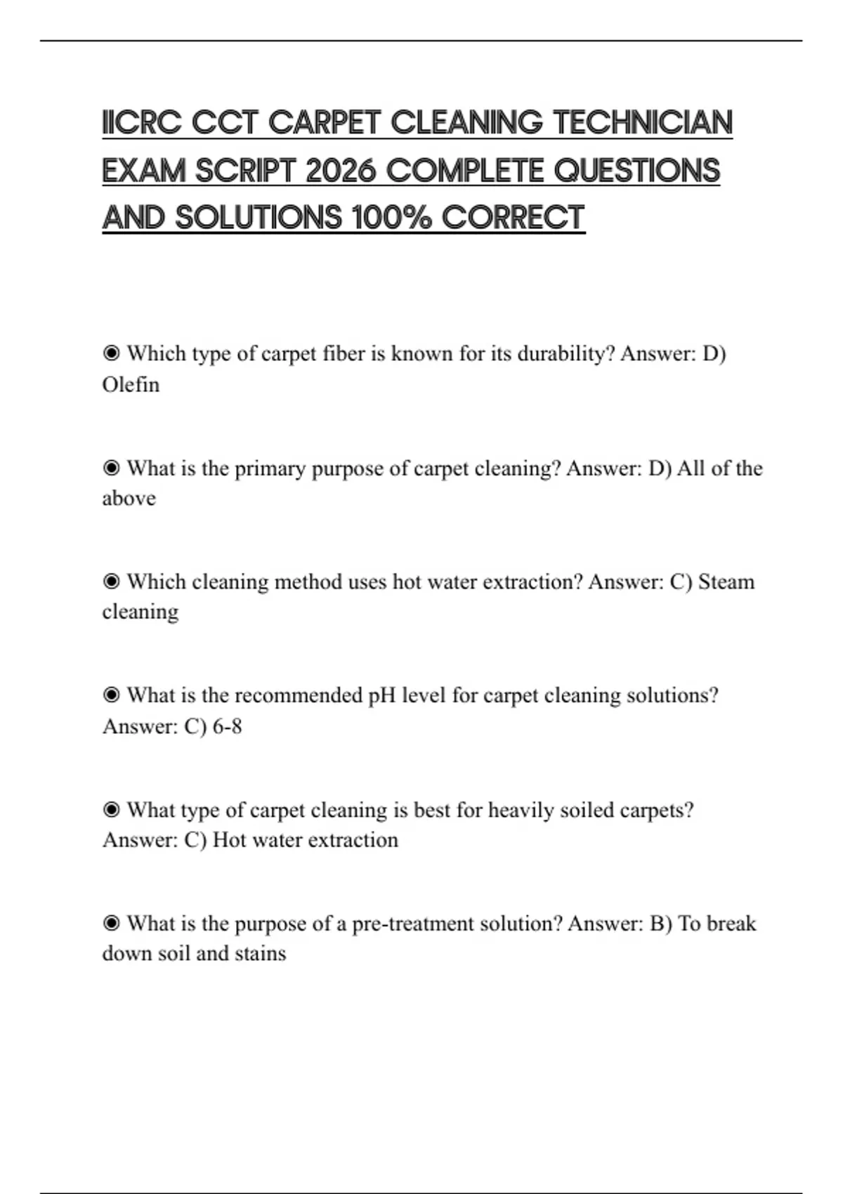 IICRC CCT CARPET CLEANING TECHNICIAN EXAM SCRIPT 2026 COMPLETE QUESTIONS AND SOLUTIONS 100% CORRECT