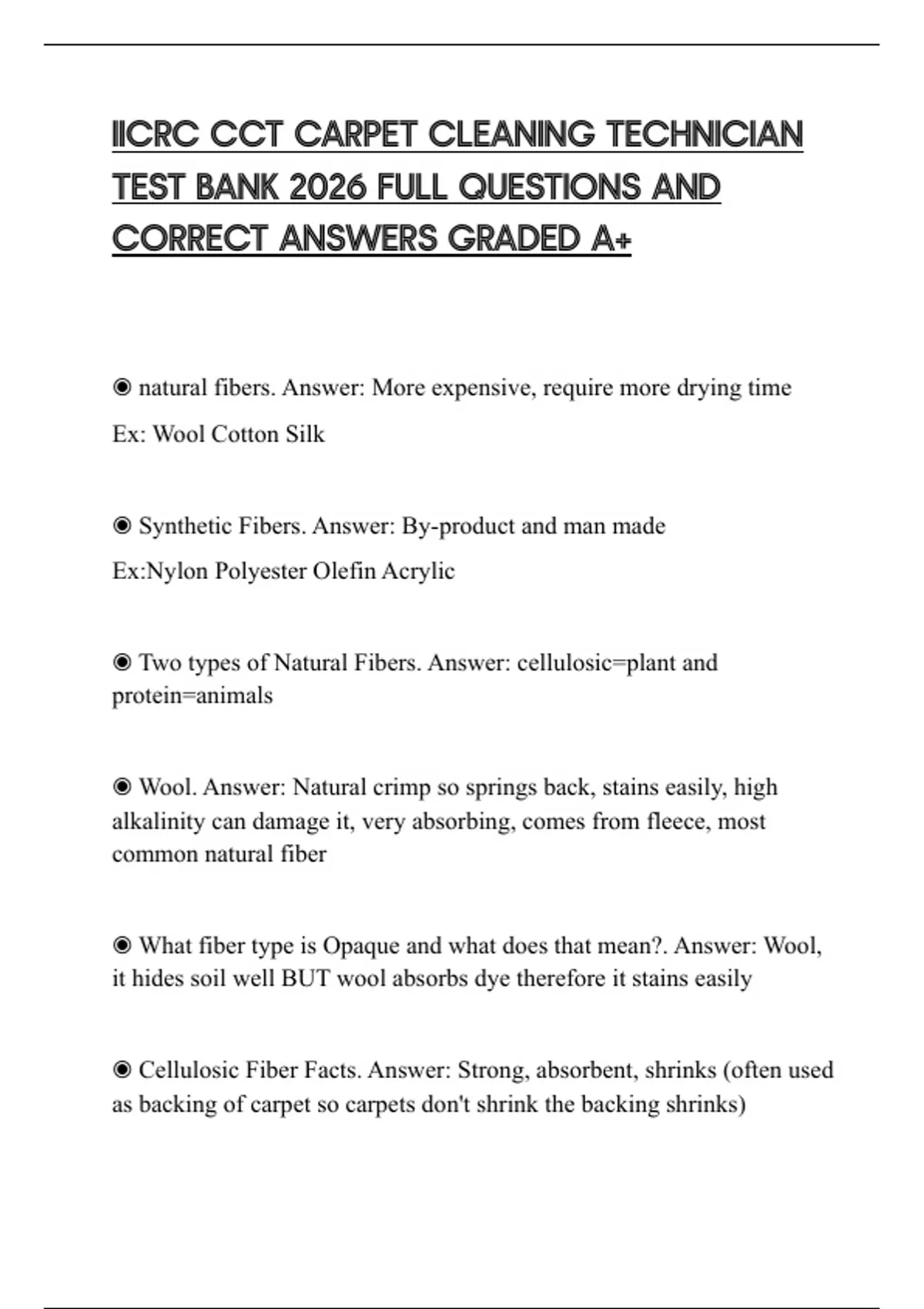 IICRC CCT CARPET CLEANING TECHNICIAN TEST BANK 2026 FULL QUESTIONS AND CORRECT ANSWERS GRADED A+