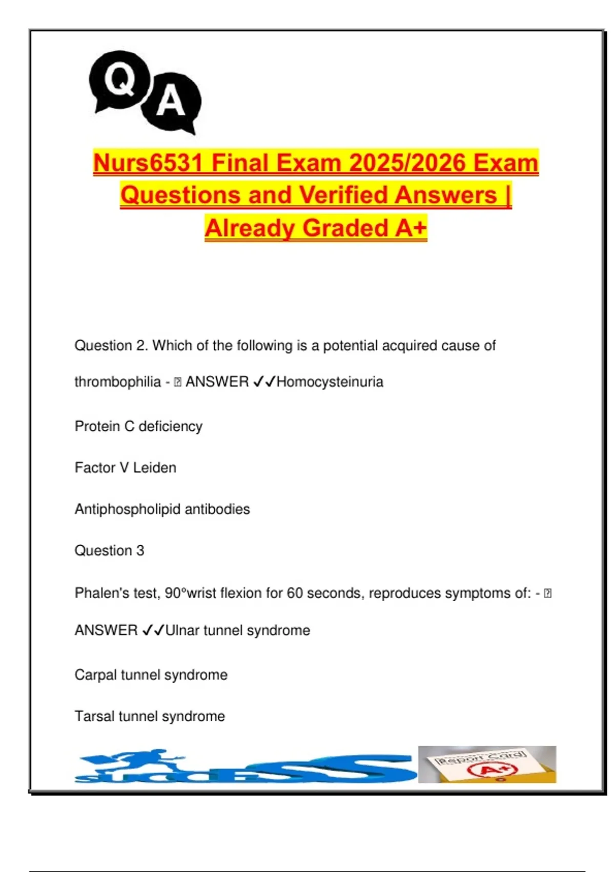 This in-depth document provides 100+ expertly answered, clinically focused multiple-choice questions from the NURS 6531 – Primary Care of Adults Final Exam, aligned with the 2025/2026 curriculum at a U.S.-based nursing school. It offers a comprehensive review of essential topics covered in advanced nurse practitioner (NP) education, making it an ideal study guide for final exams, certification prep, and clinical decision-making review. The questions span a broad range of adult primary care systems and clinical topics: Cardiology: hypertension management, stroke prevention, heart failure, dyslipidemia Endocrinology: diabetes types, Cushing’s syndrome, Addison’s disease, thyroid disorders Neurology: Parkinson’s disease, multiple sclerosis, headaches, seizures Infectious Diseases: HIV, STIs, urinary tract infections, H. pylori, prostatitis Psychiatry: depression, anxiety, bipolar disorder, PTSD Pulmonary & GI: asthma, COPD, GERD, liver disorders, abdominal pain MSK, GU & Skin: arthritis, back pain, nephrolithiasis, dermatologic signs Pharmacology: medication contraindications, adverse effects, treatment protocols Each question is paired with a verified correct answer and many include clinical reasoning and rationale—ideal for sharpening diagnostic skills and preparing for board-level questioning. Relevant for the following learners and courses: Nurse Practitioner (NP) students in FNP, AGNP, or Adult-Gerontology tracks Graduate-level nursing students in primary care or adult diagnostics courses Students preparing for AANP or ANCC certification exams Faculty seeking validated question sets for assessment or remediation The document is structured to mirror a high-stakes exam experience and reflects real-world clinical applications, ensuring learners are well-prepared for both academic and practice environments. Keywords: NURS 6531, final exam nursing, adult primary care, advanced diagnostics, NP exam questions, endocrine disorders, cardiology nursing, neurologic assessment, STI treatment, mental health nursing, Cushing’s syndrome, diabetes management, pharmacology review, NP board prep