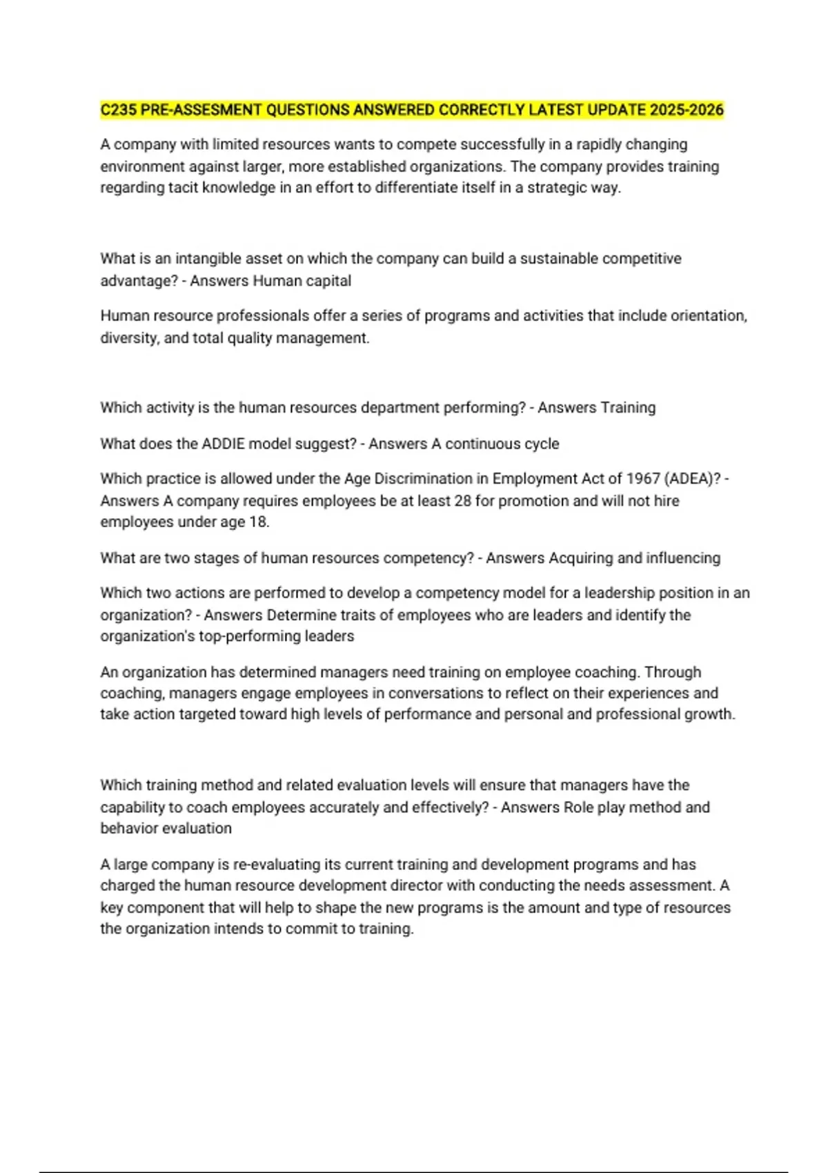 C235 PRE-ASSESMENT QUESTIONS ANSWERED CORRECTLY LATEST UPDATE A company with limited resources wants to compete successfully in a rapidly changing environment against larger, more established organizations. The company provides training regarding tacit knowledge in an effort to differentiate itself in a strategic way. What is an intangible asset on which the company can build a sustainable competitive advantage? - Answers Human capital Human resource professionals offer a series of programs and activities that include orientation, diversity, and total quality management. Which activity is the human resources department performing? - Answers Training What does the ADDIE model suggest? - Answers A continuous cycle Which practice is allowed under the Age Discrimination in Employment Act of 1967 (ADEA)? - Answers A company requires employees be at least 28 for promotion and will not hire employees under age 18. What are two stages of human resources competency? - Answers Acquiring and influencing Which two actions are performed to develop a competency model for a leadership position in an organization? - Answers Determine traits of employees who are leaders and identify the organization's top-performing leaders An organization has determined managers need training on employee coaching. Through coaching, managers engage employees in conversations to reflect on their experiences and take action targeted toward high levels of performance and personal and professional growth. Which training method and related evaluation levels will ensure that managers have the capability to coach employees accurately and effectively? - Answers Role play method and behavior evaluation A large company is re-evaluating its current training and development programs and has charged the human resource development director with conducting the needs assessment. A key component that will help to shape the new programs is the amount and type of resources the organization intends to commit to training. Whom should the director contact for this information? - Answers Senior leaders An adult education class in engineering starts out discussing the subject briefly and posing several basic questions. The class is then given several formulas related to the questions at hand, and the instructor begins working through examples to demonstrate how the questions can be answered. Which principle of adult learning is being used in this case? - Answers Starting with a problem-centered approach with immediate applications A training program uses experimental learning experiences in which the trainees discuss new technologies with the firm's best employees. The trainees are then given the opportunity to test the products and give their opinion about their quality. Which two types of learners would benefit from this training? - Answers Converger and Accommodator Which adult learning principle has been used when adult learners tie the training content to their job tasks? - Answers Acknowledging and applying personal experiences An employer wants to have managers become familiar with all of the positions they will be supervising by having the managers perform each job themselves. Which type of training and development method is appropriate in this situation? - Answers Job rotation Participants in a training program need to gain overview information on a topic about which they know little. The number of participants in the training is very large, and the trainer is an expert in the field. Which delivery method is appropriate for this training setting? - Answers Classroom lecture Which expertise is critical in instructing a group of adults? - Answers Knowledge of learning theories An organization decided to implement a new service, and they are providing training to