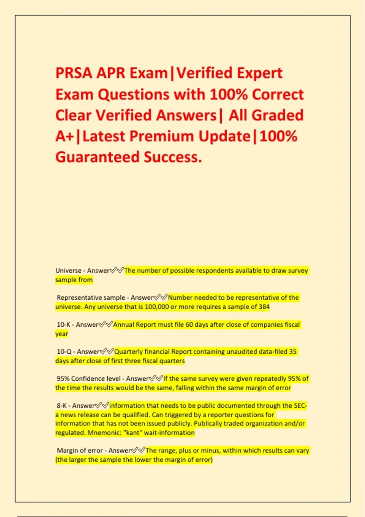 PRSA APR Exam|Verified Expert Exam Questions with 100% Correct Clear Verified Answers| All Graded A+|Latest Premium Update|100% Guaranteed Success. Universe - AnswerThe number of possible respondents available to draw survey sample from Representative sample - AnswerNumber needed to be representative of the universe. Any universe that is 100,000 or more requires a sample of 384 10-K - AnswerAnnual Report must file 60 days after close of companies fiscal year 10-Q - AnswerQuarterly financial Report containing unaudited data-filed 35 days after close of first three fiscal quarters 95% Confidence level - AnswerIf the same survey were given repeatedly 95% of the time the results would be the same, falling within the same margin of error 8-K - Answerinformation that needs to be public documented through the SEC-a news release can be qualified. Can triggered by a reporter questions for information that has not been issued publicly. Publically traded organization and/or regulated. Mnemonic: "kant" wait-information Margin of error - AnswerThe range, plus or minus, within which results can vary (the larger the sample the lower the margin of error) Proxy Statement (Form Def 14A) - Answerinvitation or agenda at for shareholders to advertise the annual meeting. Can cover-proposals for new board members, directors or executives' salaries, bonus and option plans for directors, and declarations by company management. Benchmark Survey - AnswerSurvey that is taken of a large target audience prior to a campaign. Research after campaign can be measured against this Cluster Sample - AnswerPeople who are grouped or clustered by something they have in common Content analysis - AnswerStudy of publications, print and electronic media reports to measure and evaluate news coverage of an organization, its people or activities. Attempt to objectively code and describe the content of communication. Depth interviews - AnswerOne-on-one interviews with key respondents Focus group - AnswerInformal give-and-take sessions in a controlled environment with a small group of people.(Qualitative) Formal methods - AnswerResearch that includes the systematic gathering of scientifically measurable data from representative. samples. Mail survey, telephone survey (Quantitative) Informal methods - AnswerExploratory research that is not gathered from scientifically represented samples (focus groups, key influencers, letters/complaints received Regulation Fair Disclosure (2000) - Answerall publicly traded companies disclose material information to all investors at the same time (at all levels) Insider Trading Study (1963) - AnswerEncourages timely disclosure of "material information" Rule 5c (Security Act of 1933) - AnswerGag period-registration of securities and led to embargo of publicity materials during a specific timeframe (90 days from registration becomes effective) Think-high 5 for keeping your mouth shut ;) Sarbanes Oxley (2002) - AnswerCorporate auditing accountability, responsibility, and transparency. mandated a number of reforms to enhance corporate responsibility, enhance financial disclosures and combat corporate and accounting fraud, and created the "Public Company Accounting Oversight Board," to oversee the activities of the auditing profession. Think Oxley-sounds like Auditing/Accounting Fraud