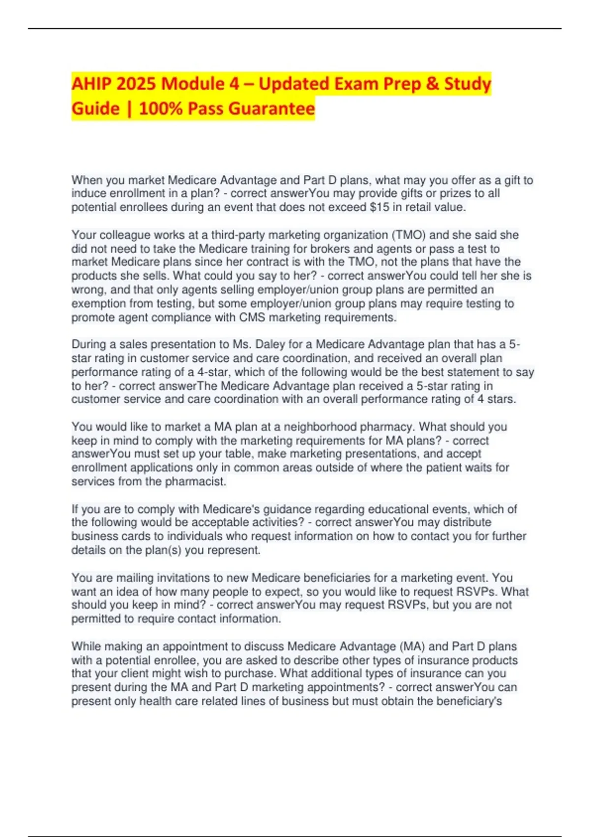 Get ready to ace the AHIP 2025 Module 4 Exam with this fully updated study guide and exam prep resource! Designed specifically for insurance professionals and agents, this guide includes verified questions and accurate answers aligned with the latest 2025 AHIP updates. Module 4 covers essential Medicare Advantage and Part D compliance concepts, fraud prevention, and policy updates—everything you need to master the test with confidence. What’s Inside: Real-style AHIP Module 4 practice questions Verified answers with concise explanations Covers Medicare Advantage, FWA, and compliance updates Perfect for first-time test takers or recertification 100% Pass Guarantee – study smarter, not harder This guide ensures you understand the reasoning behind each answer—making it your ultimate tool to pass AHIP 2025 Module 4 on your first attempt.