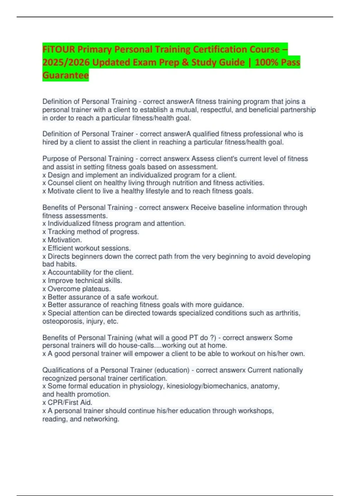 FiTOUR Primary Personal Training Certification Course – 2025/2026 Updated Exam Prep & Study Guide | 100% Pass Guarantee