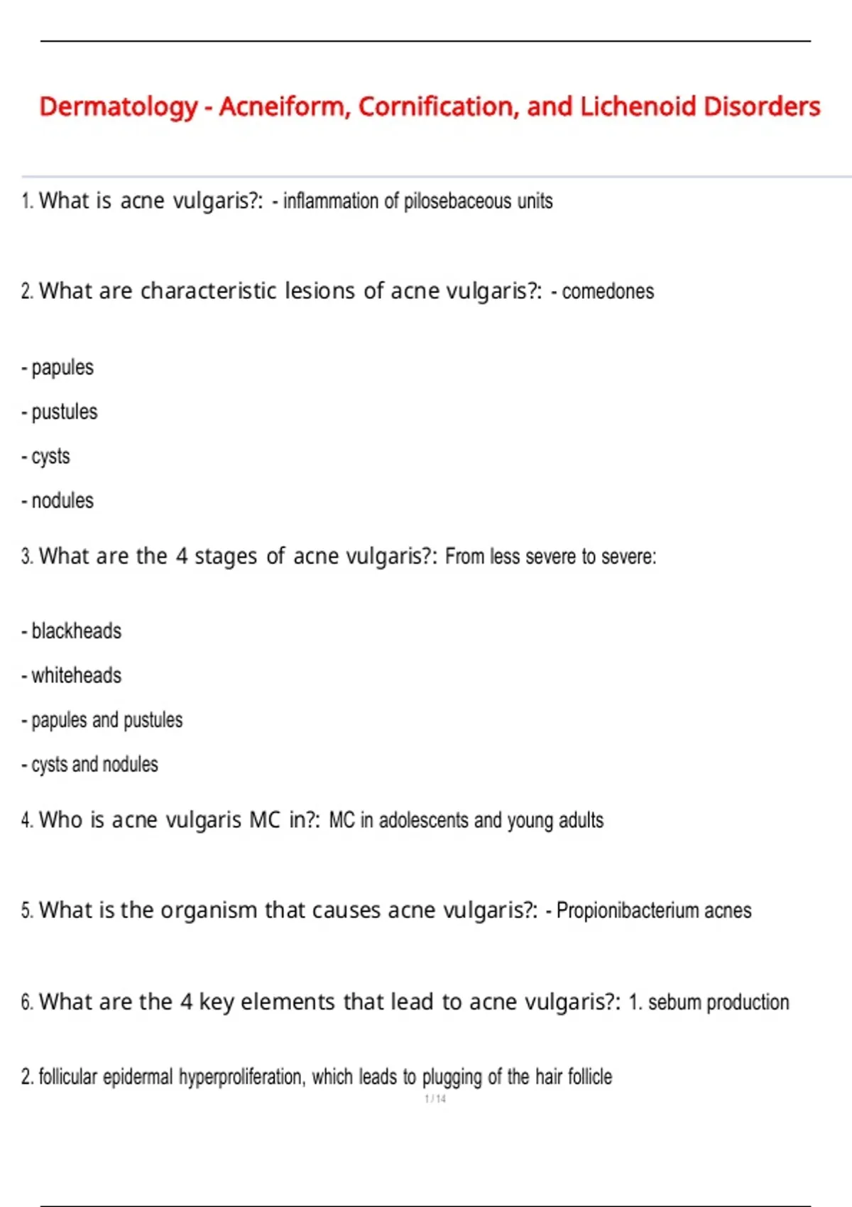 1. What is acne vulgaris?: - inflammation of pilosebaceous units