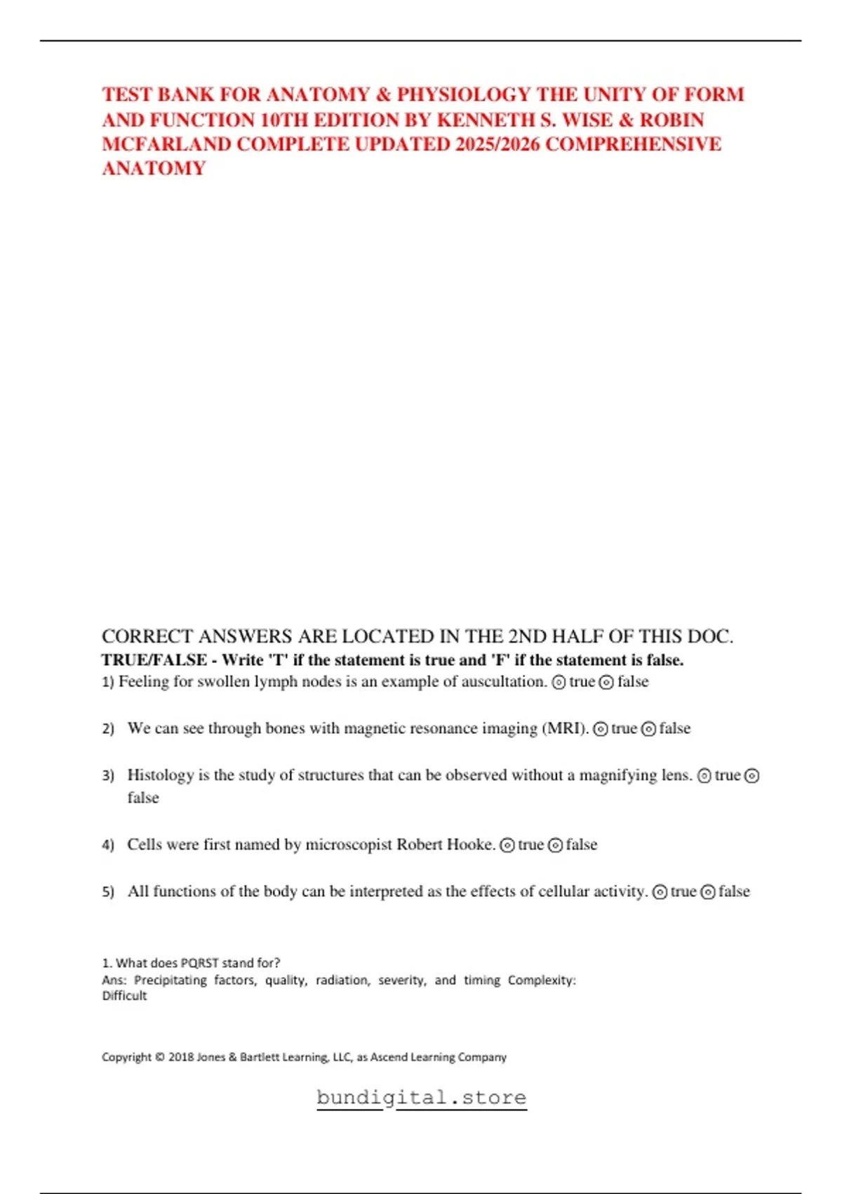 TEST BANK FOR ANATOMY & PHYSIOLOGY THE UNITY OF FORM AND FUNCTION 10TH EDITION BY KENNETH S. WISE & ROBIN MCFARLAND COMPLETE UPDATED 2025/2026 COMPREHENSIVE ANATOMY