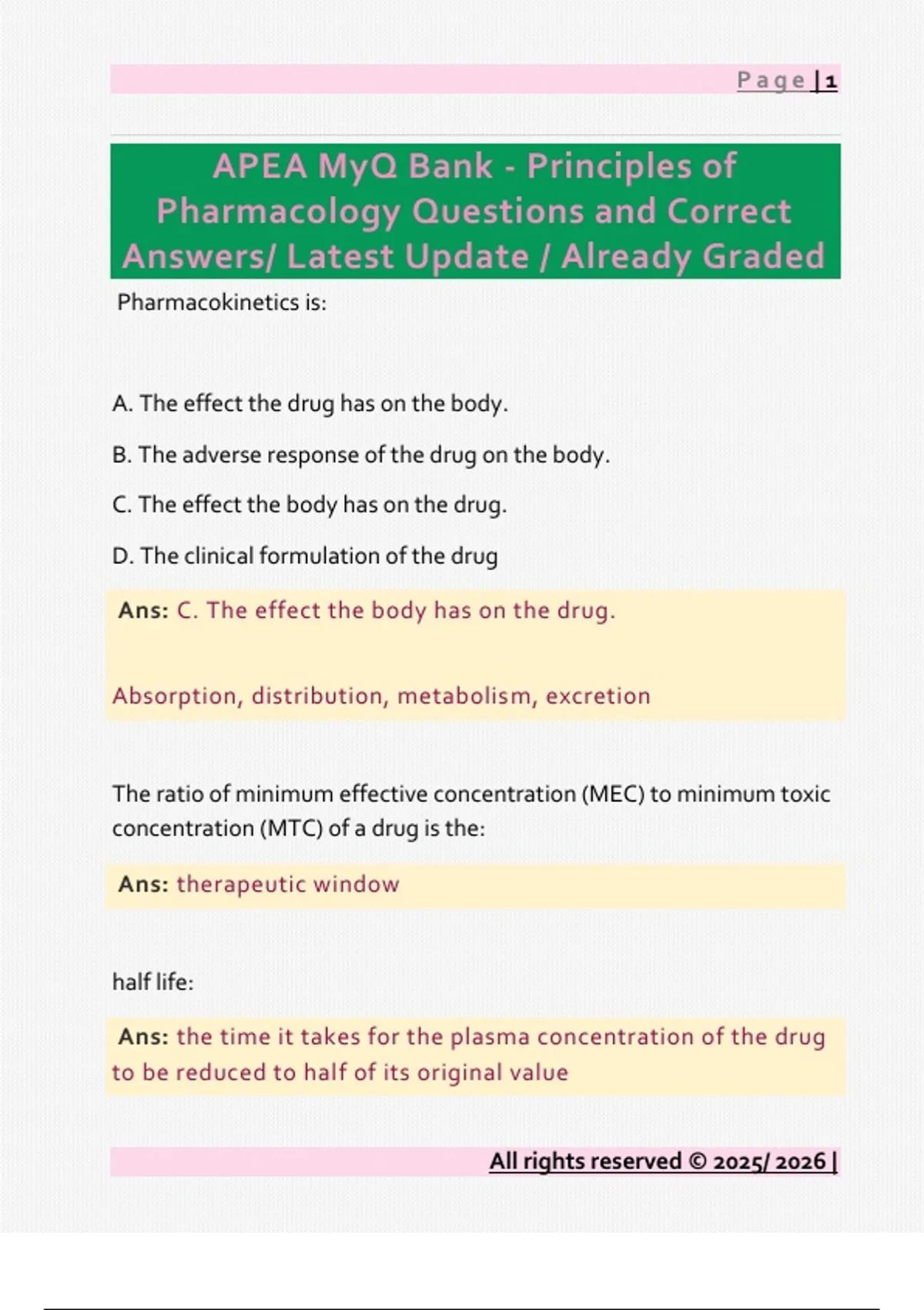 APEA MyQ Bank - Principles of Pharmacology Questions and Correct Answers/ Latest Update / Already Graded