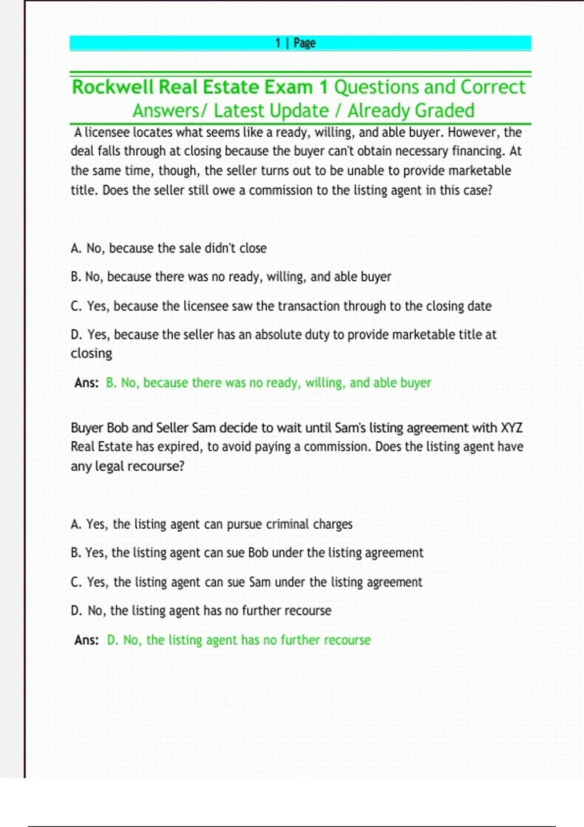Rockwell Real Estate Exam 1 Questions and Correct Answers | Latest Update | Already Graded