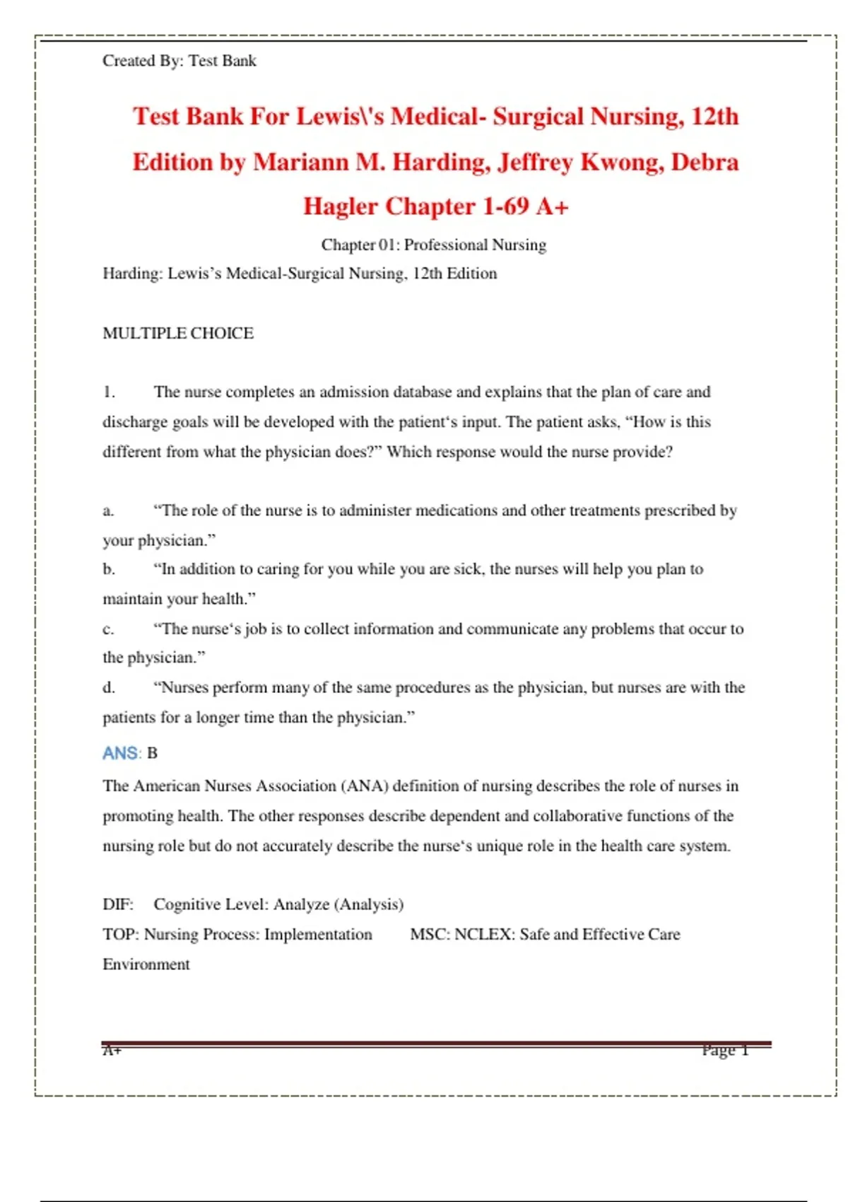 Test Bank For Lewis\'s Medical- Surgical Nursing, 12th