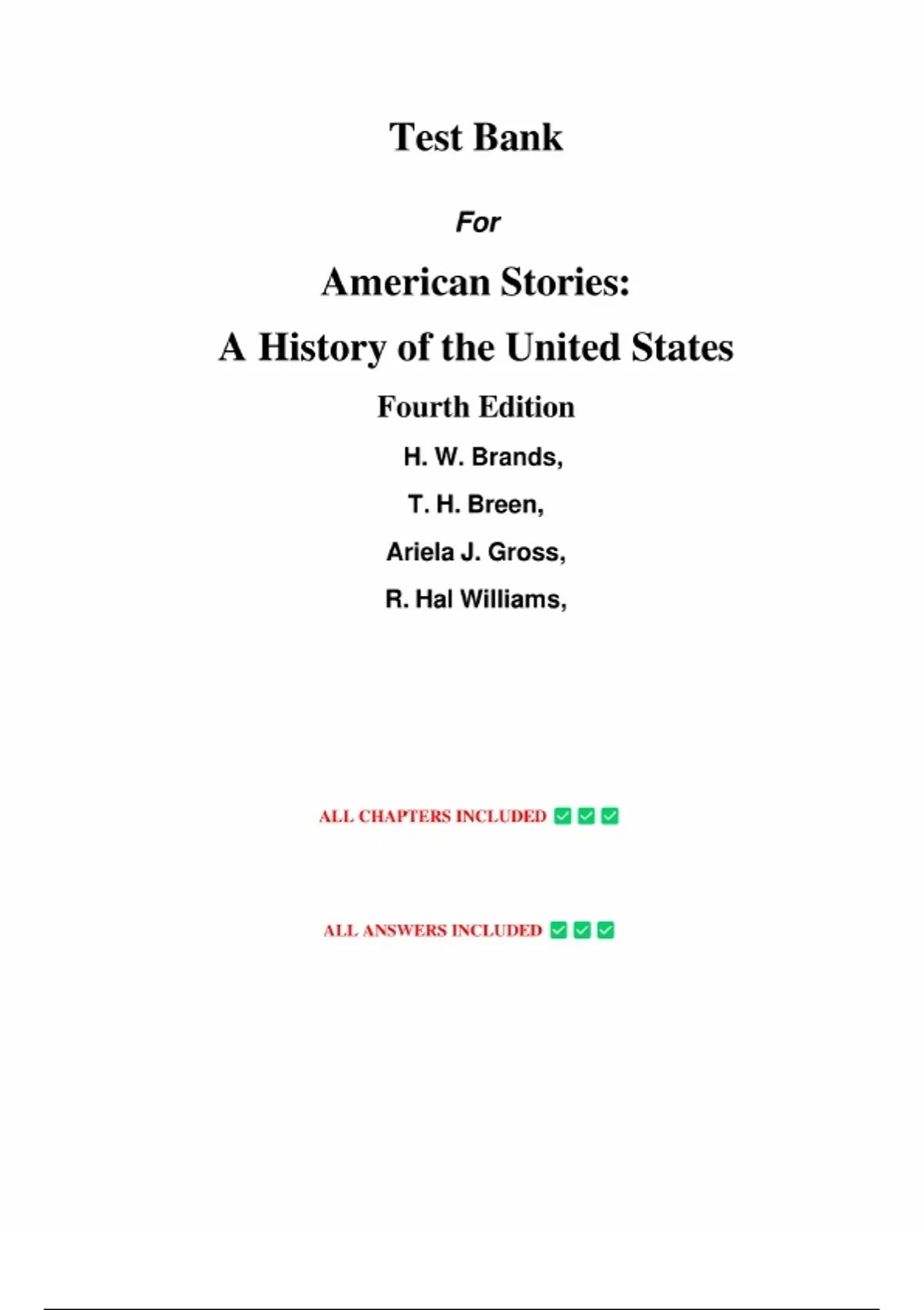 American Stories: A History of the United States, Combined Volume, 4th Edition – H. W. Brands | Complete Test Bank (Chapters 1–32)...1. New World Encounters: Preconquest - 1608, 2. England's New World Experiments, , 3. Putting Down Roots: Opportunity and Oppression in Colonial Society, , 4. Experience of Empire: Eighteenth-Century America, , 5. The American Revolution: From Elite Protest to Popular Revolt, , 6. The Republican Experiment, , 7. Democracy and Dissent: The Violence of Party Politics, , 8. Republican Ascendancy: The Jeffersonian Vision, , 9. Nation Building and Nationalism, , 10. The Triumph of White Men's Democracy, , 11. Slaves and Masters, , 12. The Pursuit of Perfection, , 13. An Age of Expansionism, , 14. The Sectional Crisis, , 15. Secession and the Civil War, , 16. The Agony of Reconstruction, , 17. The West: Exploiting an Empire, , 18. The Industrial Society, , 19. Toward an Urban Society, , 20. Political Realignments, , 21. Toward Empire, , 22. The Progressive Era, , 23. From Roosevelt to Wilson in the Age of Progressivism, , 24. The Nation at War, , 25. Transition to Modern America, , 26. Franklin D. Roosevelt and the New Deal, , 27. America and the World, , 28. The Onset of the Cold War, , 29. Affluence and Anxiety, , 30. The Turbulent Sixties, , 31. To a New Conservatism, , 32. Into the Twenty-First Century,