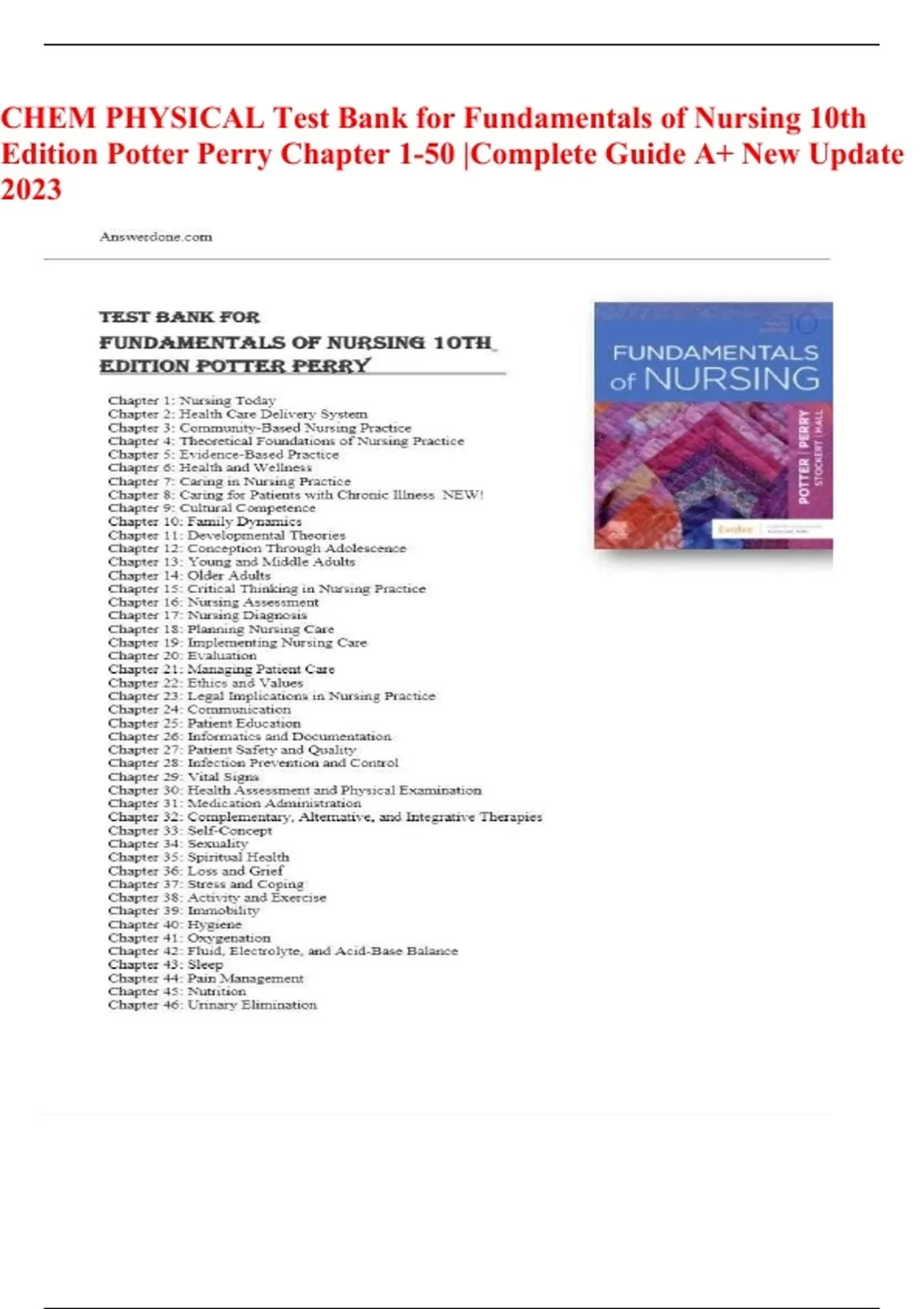 This document provides the complete test bank for Fundamentals of Nursing (10th Edition) by Potter and Perry, covering Chapters 1–50 in full detail. It includes multiple-choice and scenario-based questions with accurate answers and rationales focused on core nursing concepts such as patient safety, clinical judgment, health promotion, infection control, communication, and professional practice. Updated to the newest edition, this resource is ideal for nursing students preparing for exams, HESI, or NCLEX success.
