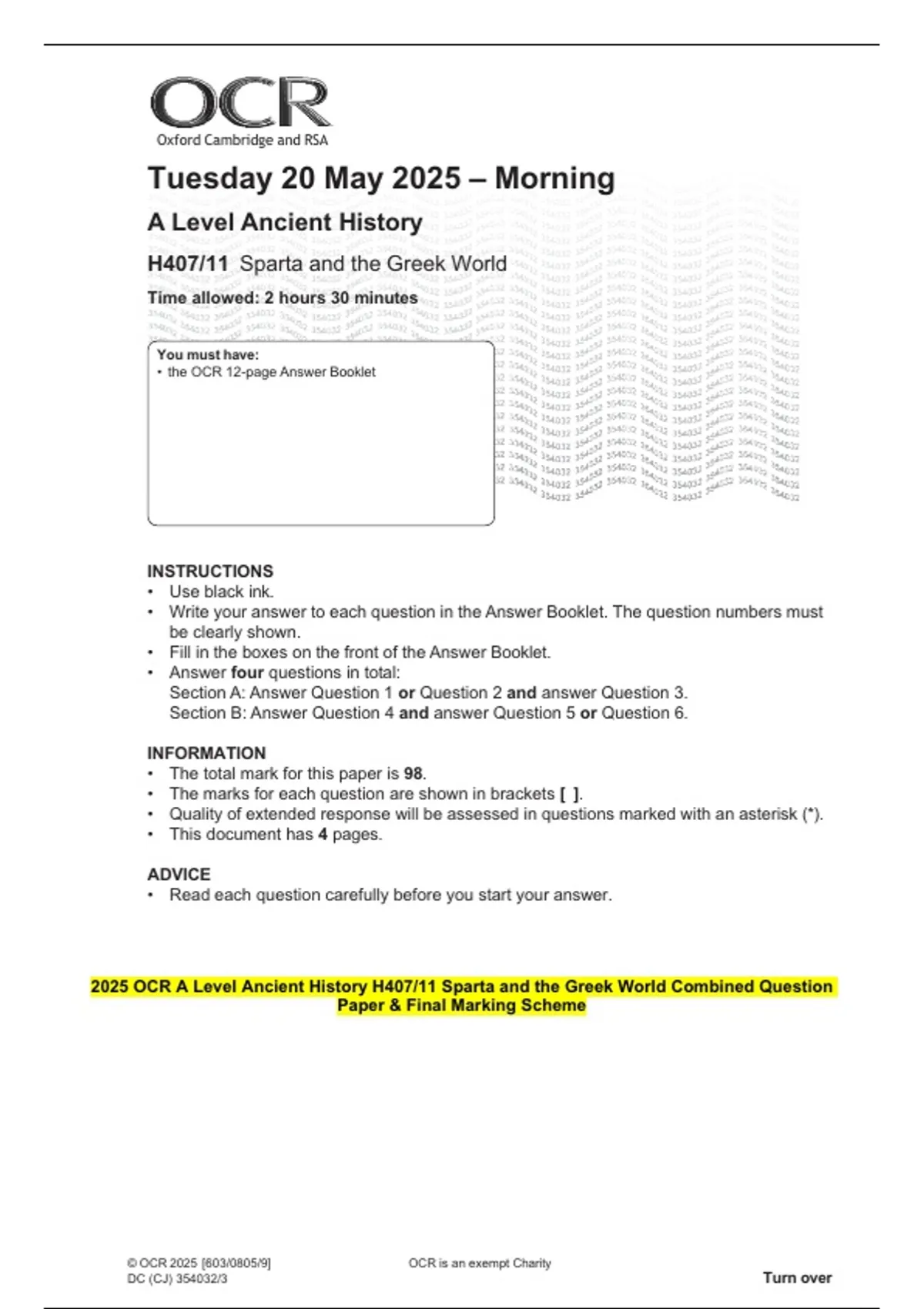 2025 OCR A Level Ancient History H407/11 Sparta and the Greek World Combined Question