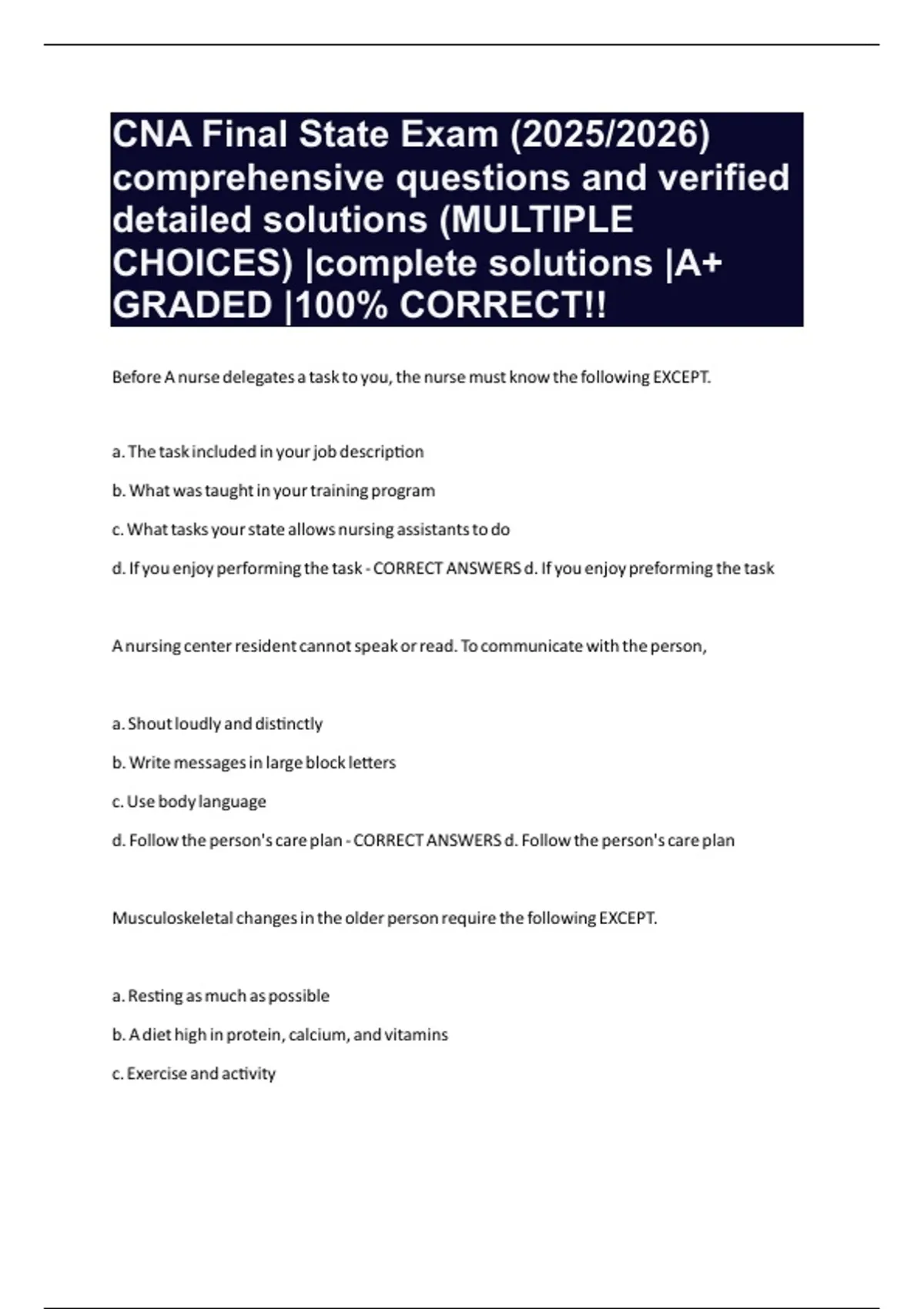 CNA Final State Exam (2025/2026) comprehensive questions and verified detailed solutions (MULTIPLE CHOICES) |complete solutions |A+ GRADED |100% CORRECT!!