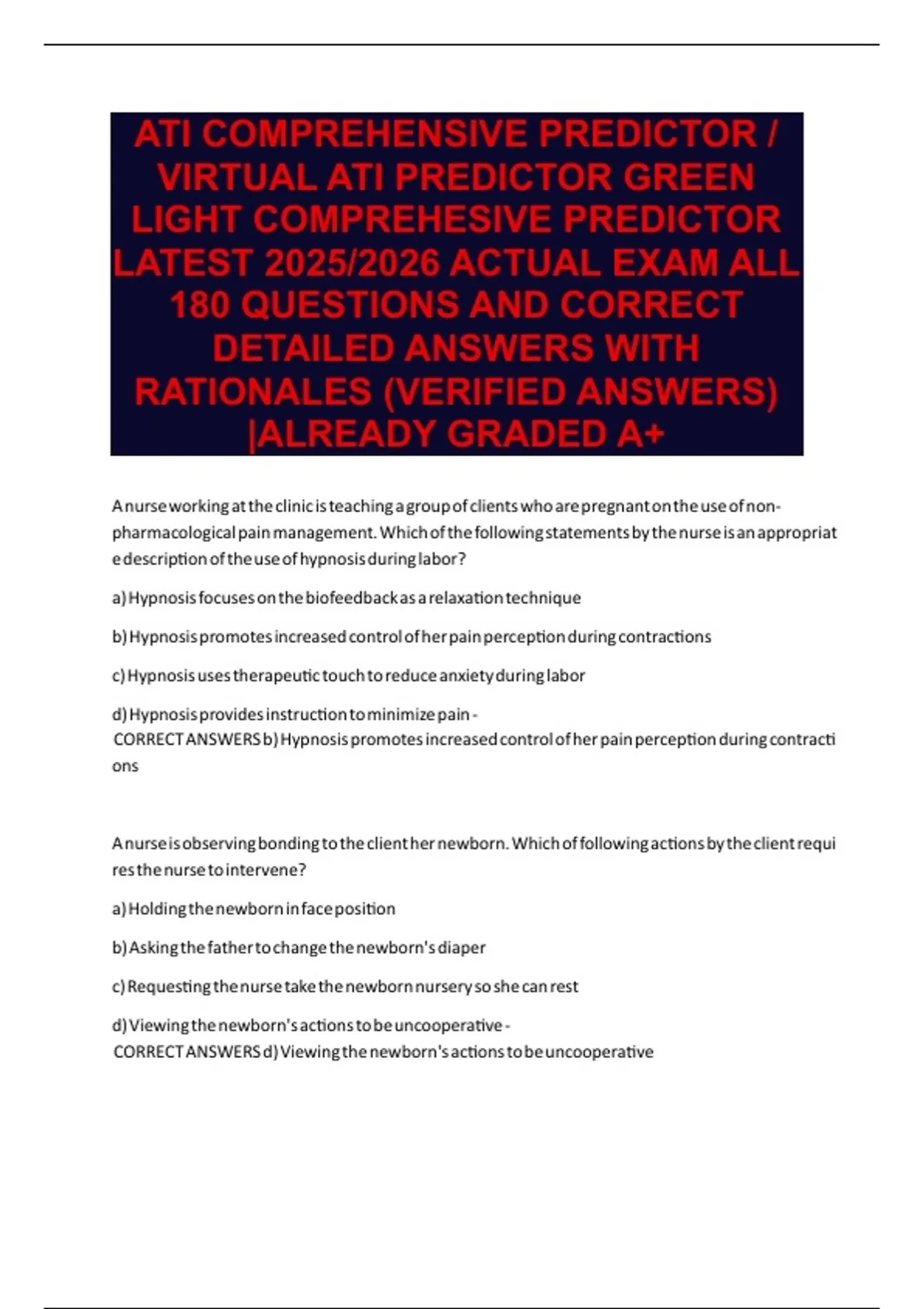 ATI COMPREHENSIVE PREDICTOR / VIRTUAL ATI PREDICTOR GREEN LIGHT COMPREHESIVE PREDICTOR LATEST 2025/2026 ACTUAL EXAM ALL 180 QUESTIONS AND CORRECT DETAILED ANSWERS WITH RATIONALES (VERIFIED ANSWERS) |ALREADY GRADED A+
