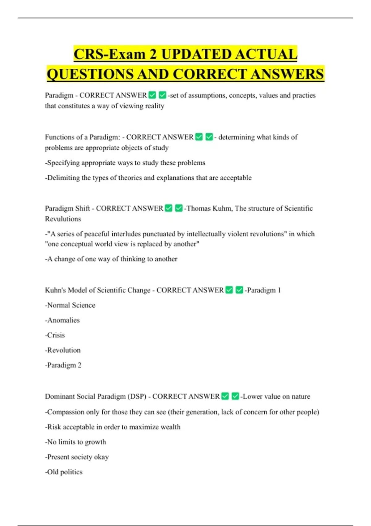 CRS-Exam 2 UPDATED ACTUAL QUESTIONS AND CORRECT ANSWERS Paradigm - CORRECT ANSWER that constitutes a way of viewing reality -set of assumptions, concepts, values and practies Functions of a Paradigm: - CORRECT ANSWER problems are appropriate objects of study -Specifying appropriate ways to study these problems - determining what kinds of -Delimiting the types of theories and explanations that are acceptable Paradigm Shift - CORRECT ANSWER Revulutions -Thomas Kuhm, The structure of Scientific -"A series of peaceful interludes punctuated by intellectually violent revolutions" in which "one conceptual world view is replaced by another" -A change of one way of thinking to another Kuhn's Model of Scientific Change - CORRECT ANSWER -Normal Science -Anomalies -Crisis -Revolution -Paradigm 2 Dominant Social Paradigm (DSP) - CORRECT ANSWER -Paradigm 1 -Lower value on nature -Compassion only for those they can see (their generation, lack of concern for other people) -Risk acceptable in order to maximize wealth -No limits to growth -Present society okay -Old politics New Environmental Paradigm (NEP) - CORRECT ANSWER -Generalized compassion toward others -careful plans an actions to avoid risk -Limits to growth -completely new society -New Politics Beus & Dunlap - CORRECT ANSWER -High value on nature