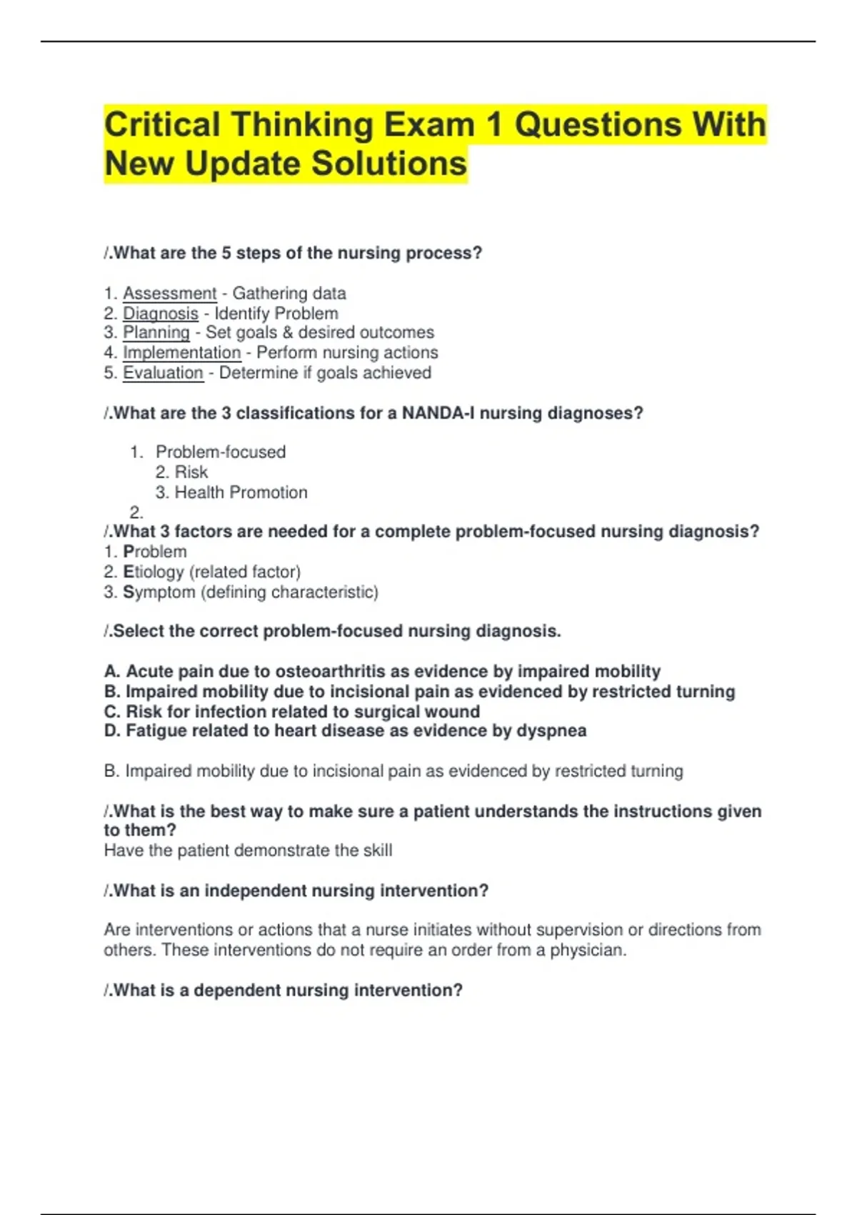 Critical Thinking Exam 1 Questions With New Update Solutions /.What are the 5 steps of the nursing process? 1. Assessment - Gathering data 2. Diagnosis - Identify Problem 3. Planning - Set goals & desired outcomes 4. Implementation - Perform nursing actions 5. Evaluation - Determine if goals achieved /.What are the 3 classifications for a NANDA-I nursing diagnoses? 1. Problem-focused 2. Risk 3. Health Promotion 2. /.What 3 factors are needed for a complete problem-focused nursing diagnosis? 1. Problem 2. Etiology (related factor) 3. Symptom (defining characteristic) /.Select the correct problem-focused nursing diagnosis. A. Acute pain due to osteoarthritis as evidence by impaired mobility B. Impaired mobility due to incisional pain as evidenced by restricted turning C. Risk for infection related to surgical wound D. Fatigue related to heart disease as evidence by dyspnea B. Impaired mobility due to incisional pain as evidenced by restricted turning /.What is the best way to make sure a patient understands the instructions given to them? Have the patient demonstrate the skill /.What is an independent nursing intervention? Are interventions or actions that a nurse initiates without supervision or directions from others. These interventions do not require an order from a physician. /.What is a dependent nursing intervention? Are interventions or actions that require an order from a physician. They are based on the health care provider's response to treating or managing a medical diagnosis. /.Give an example of an independent nursing intervention. Positioning patients to prevent pressure ulcer formation, instructing patients in side effects of medications, or providing skin care to an ostomy site. /.Give an example of a dependent nursing intervention. Administering a medication, Inserting a foley catheter, starting an IV, preparing a patient for diagnostic tests /.What is subjective data? Are your patient's verbal descriptions of their health problems. Includes patients' feelings, perceptions, and self-report or symptoms. /.What is objective data? Are observations or measurements of a patient's health status. It measured on the basis of an accepted standard (fahrenheit/celsius, inches/centimeters/pain rating scale) /.What is an example of subjective data? Patient's self report of pain, location, quality. Patient's descriptions of symptoms (weakness, fatigue). Patient's report of mental status (feeling down, anxious). /.What is an example of objective data? Inspecting the condition of a surgical incision or wound. Describing an observed behavior. Measuring blood pressure, temperature, pulse. /.Which type of interview question does the nurse 1st use when assessing the reason for a pt seeking health care? A. Probing B. Open-ended C. Problem-oriented D. Confirmation B. Open-ended