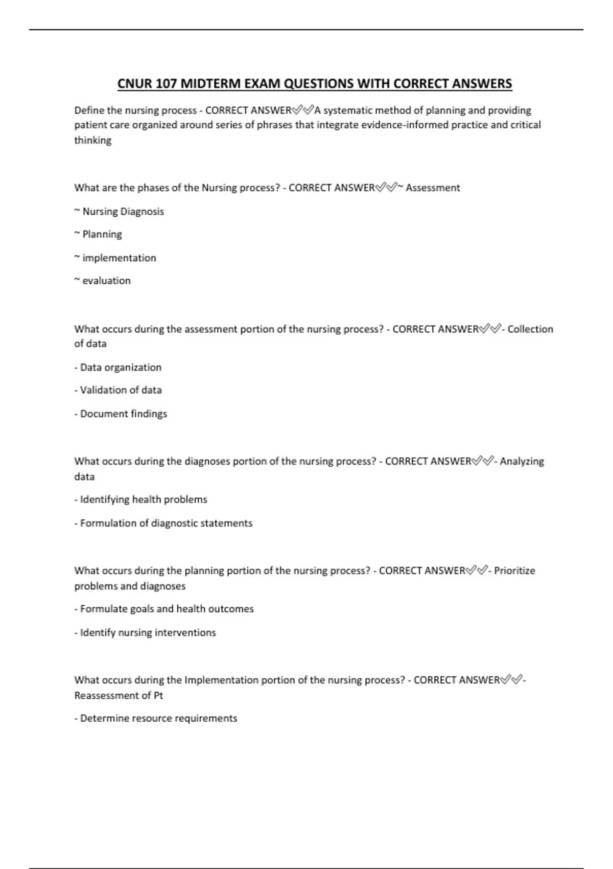 CNUR 107 MIDTERM EXAM QUESTIONS WITH CORRECT ANSWERS Define the nursing process - CORRECT ANSWERA systematic method of planning and providing patient care organized around series of phrases that integrate evidence-informed practice and critical thinking