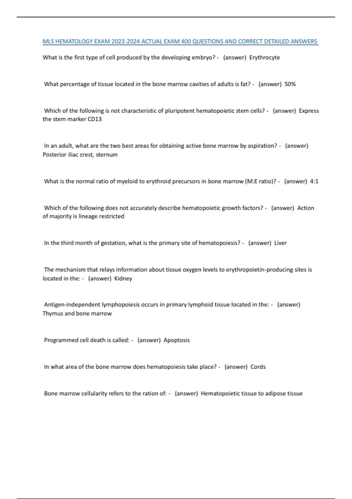 , MLS HEMATOLOGY EXAM 2023-2024 ACTUAL EXAM 400 QUESTIONS AND CORRECT DETAILED ANSWERS