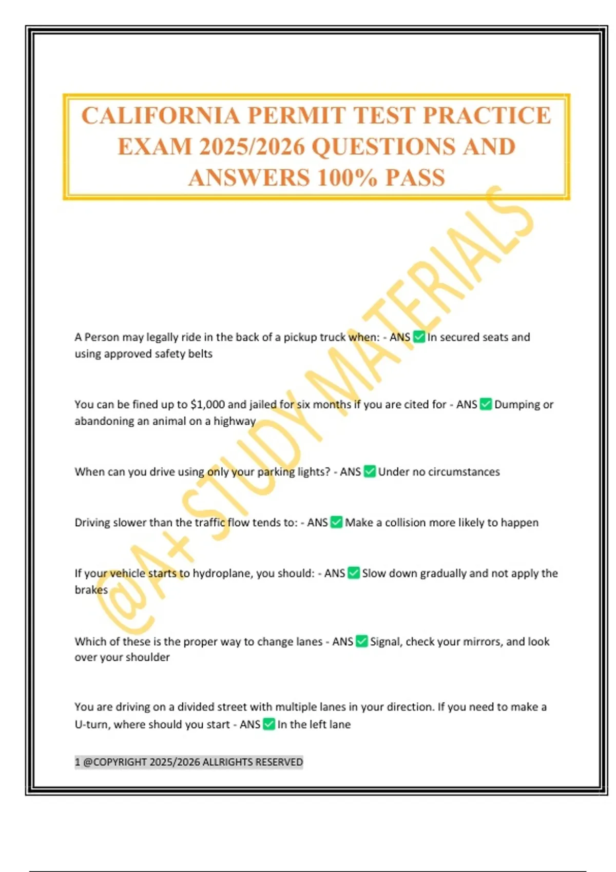 CALIFORNIA PERMIT TEST PRACTICE EXAM 2025/2026 QUESTIONS AND ANSWERS 100% PASS