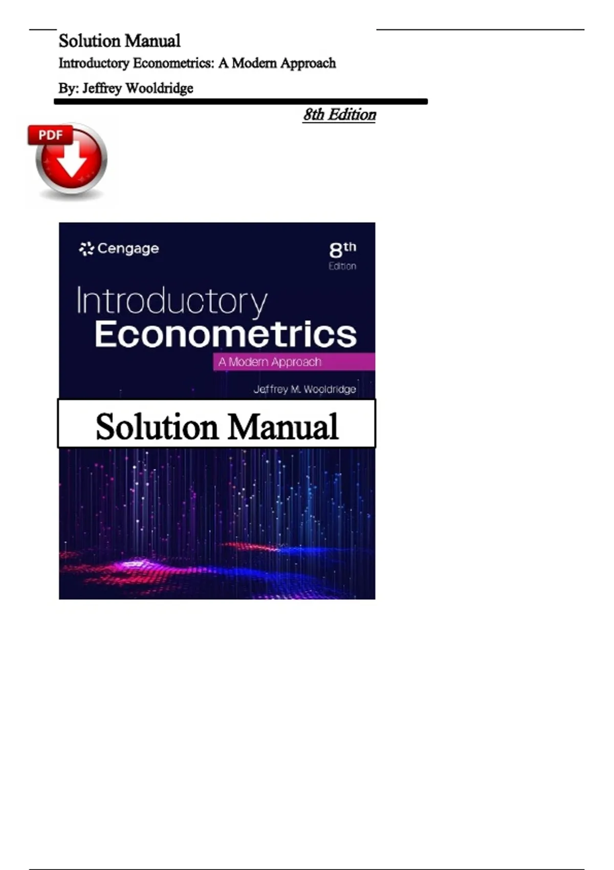 Solutions Manual – Introductory Econometrics: A Modern Approach, 8th Edition by Jeffrey M. Wooldridge All Chapters Covered Master the art and science of econometric analysis with the Solutions Manual for Introductory Econometrics: A Modern Approach (8th Edition) by Jeffrey M. Wooldridge. This comprehensive guide provides complete, detailed, and verified solutions to every problem and exercise in the 8th Edition textbook, making it the ultimate resource for students, instructors, and researchers in economics, statistics, and business analytics. Built to complement Wooldridge’s globally recognized textbook, this solutions manual delivers step-by-step explanations for applied econometric problems, ensuring that readers not only find the correct answers but also understand the logic and methodology behind each statistical process. Whether you’re working through regression models, hypothesis testing, time series analysis, or panel data, Introductory Econometrics 8th Edition Solutions Manual, Jeffrey Wooldridge econometrics solutions, Wooldridge econometrics textbook answers, econometrics step-by-step guide, regression analysis solutions manual, econometrics with Stata solutions, applied econometrics workbook, time series and panel data econometrics solutions, instrumental variables and regression answers, undergraduate econometrics study guide, graduate econometrics solutions manual, data analysis and hypothesis testing workbook, modern econometric modeling guide, econometrics instructor resource, university econometrics problem solutions, economic data interpretation manual