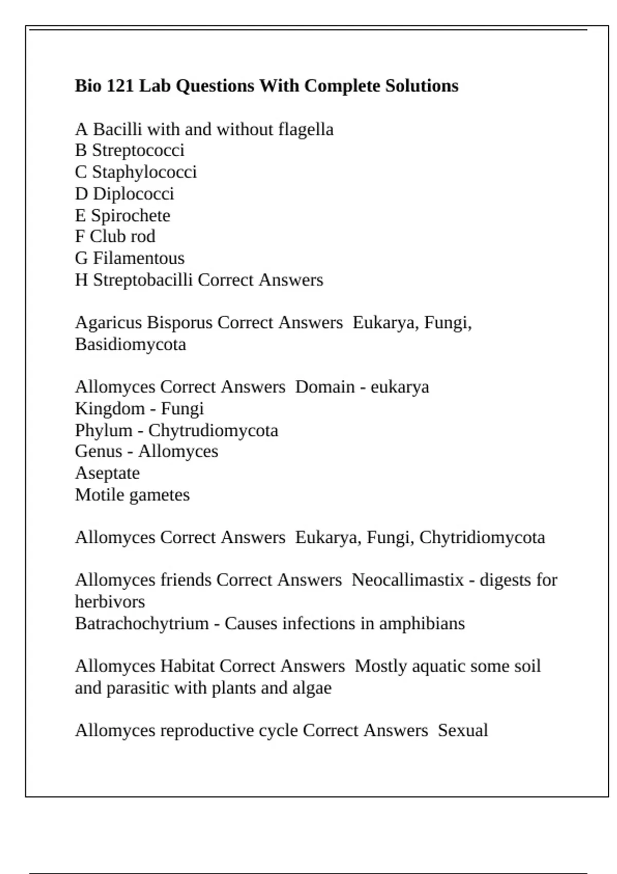 Bio 121 Lab Questions With Complete Solutions